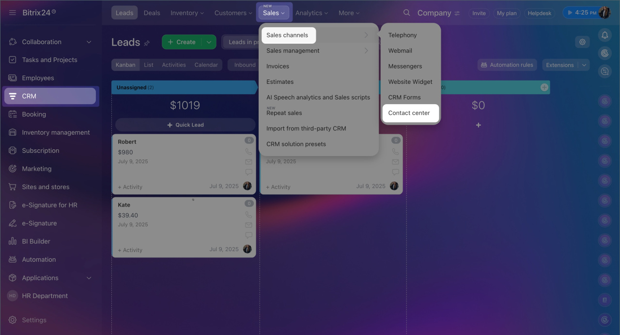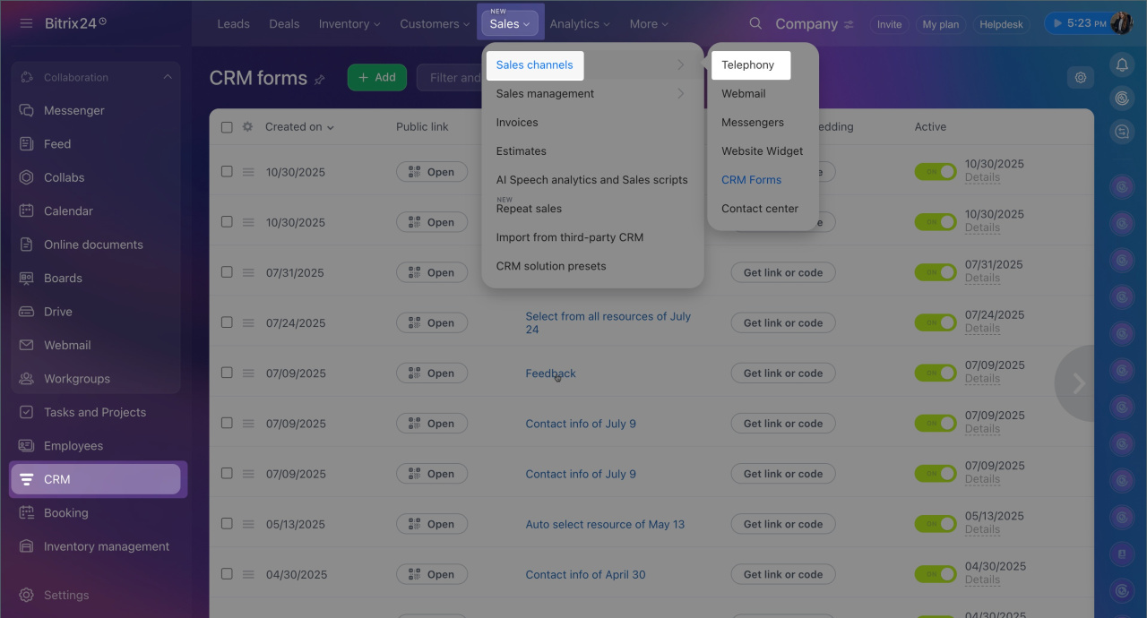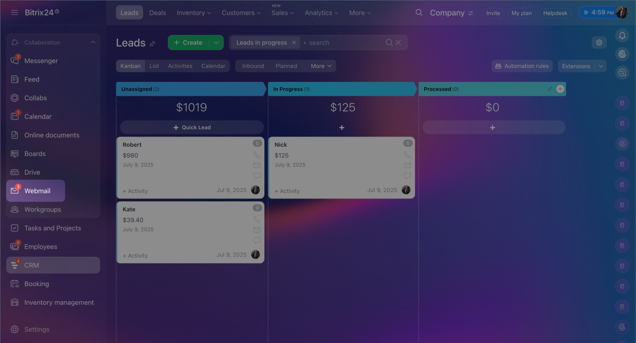 - Inquiries from messengers, social networks, email, CRM forms, and telephony can be automatically distributed among employees in Bitrix24.