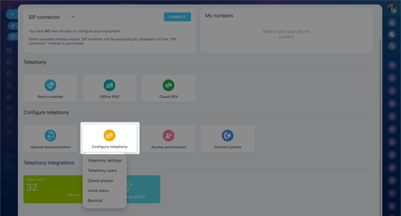 - Distribution of incoming calls among employees is set up in CRM > Sales > Sales Channels > Telephony > Number settings. Select the number, then go to the Incoming call routing and CRM Integration tabs.