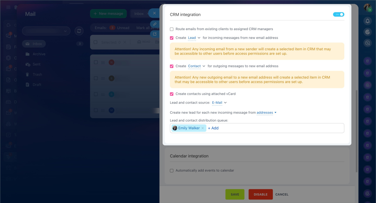 If an email account is connected to Bitrix24 and integrated with CRM, you can automatically distribute emails among employees and assign responsible persons for new inquiries.