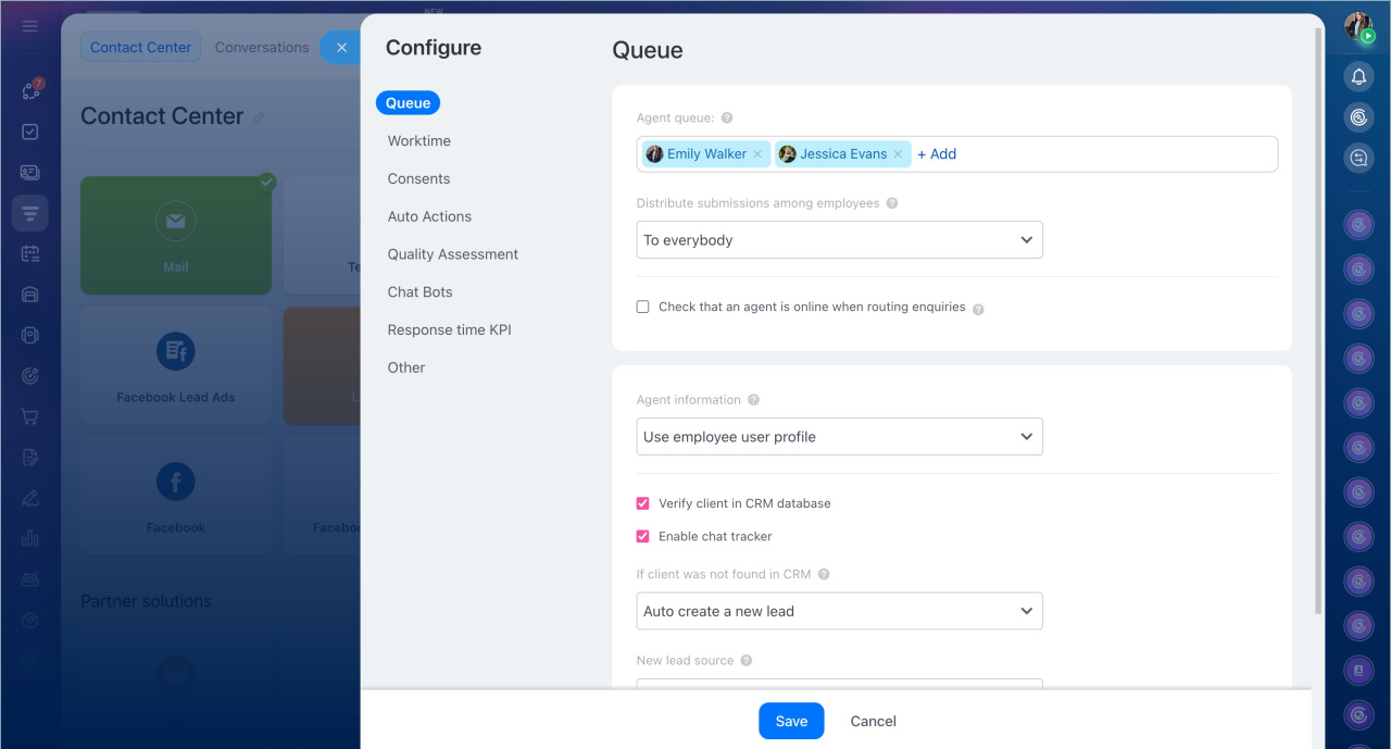 - Queue for distributing leads and contacts — select employees to whom CRM will assign inquiries. New CRM items will be distributed among employees in the order their names are listed.