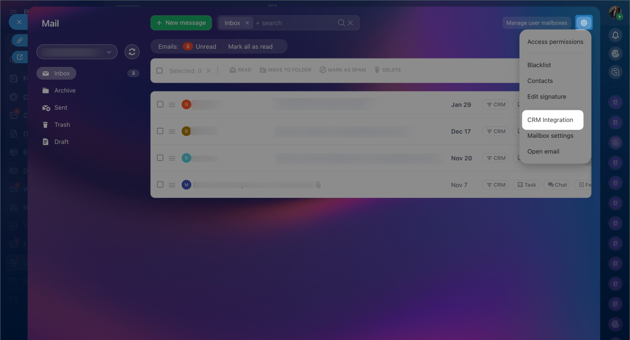 1. Go to Email > Settings (⚙️) > CRM Integration.