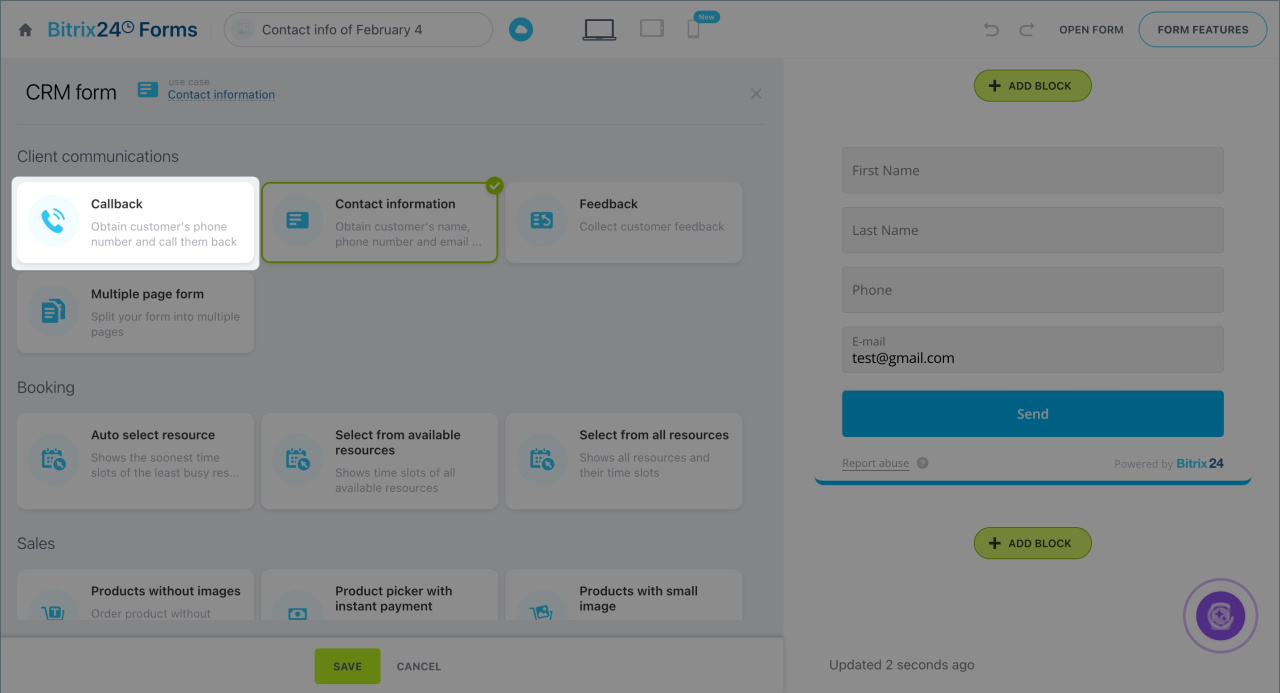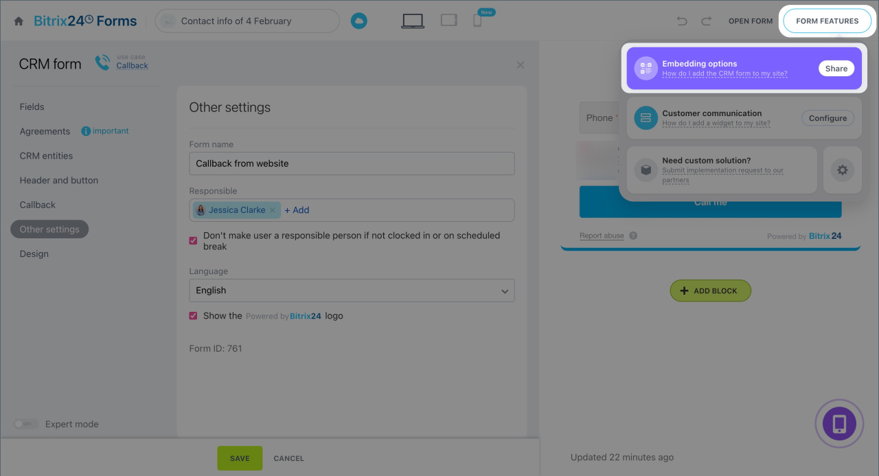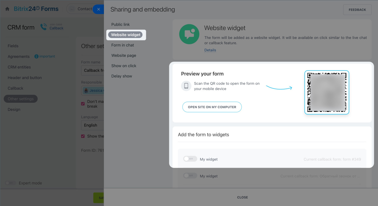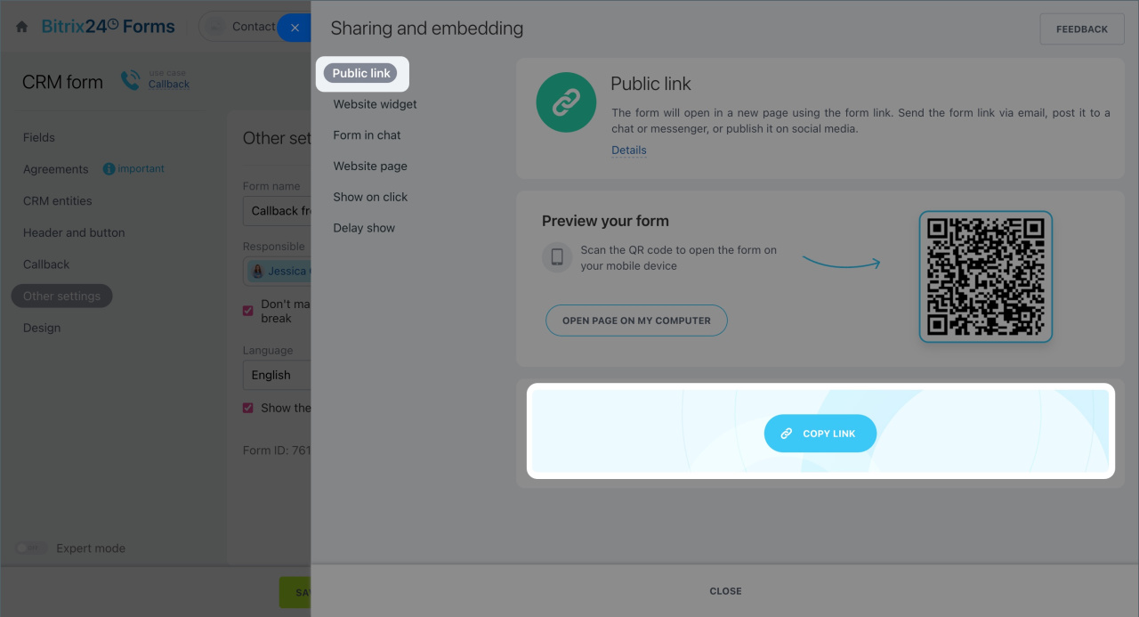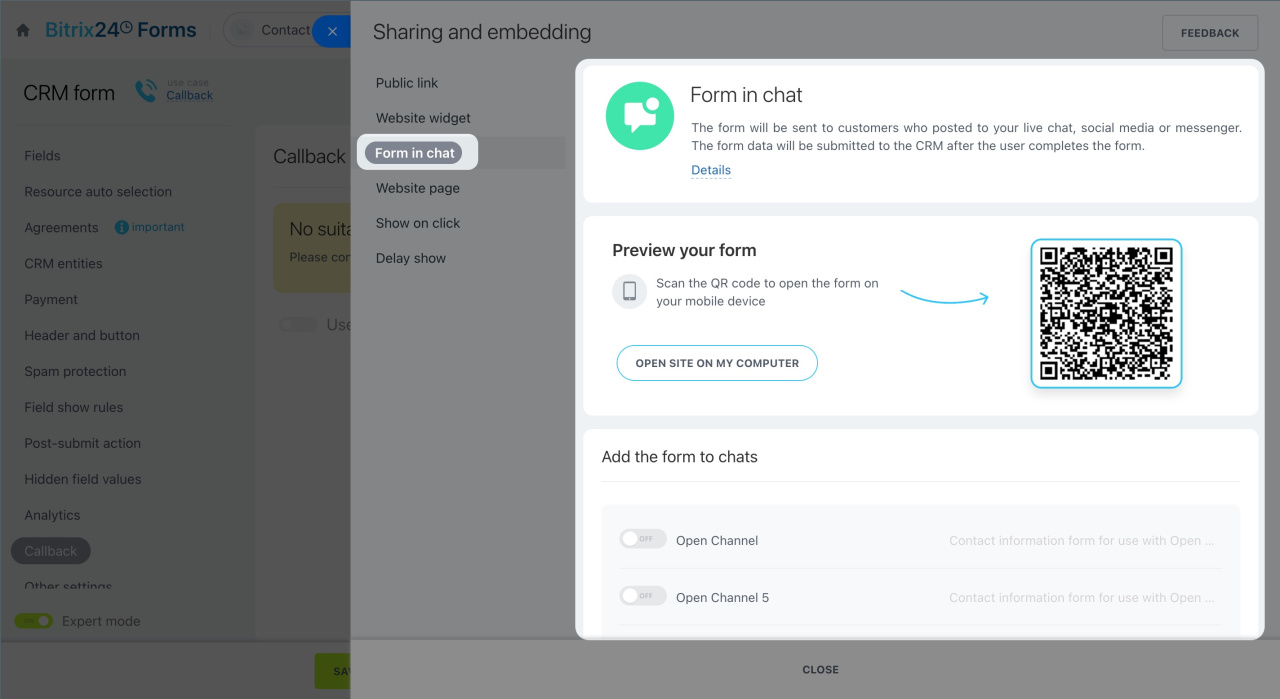 - You can place the callback form on a separate page, on your website, or send it in a chat with a customer. Click Form features > Share and choose a publication method.