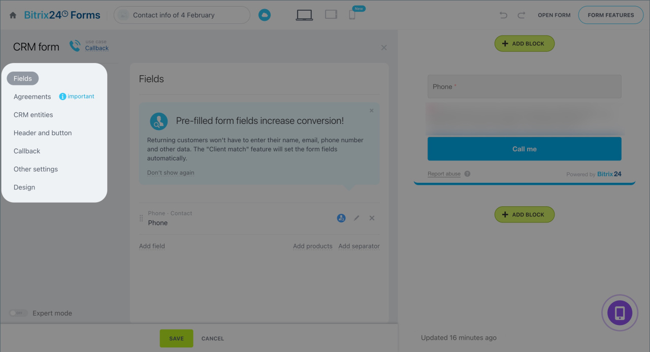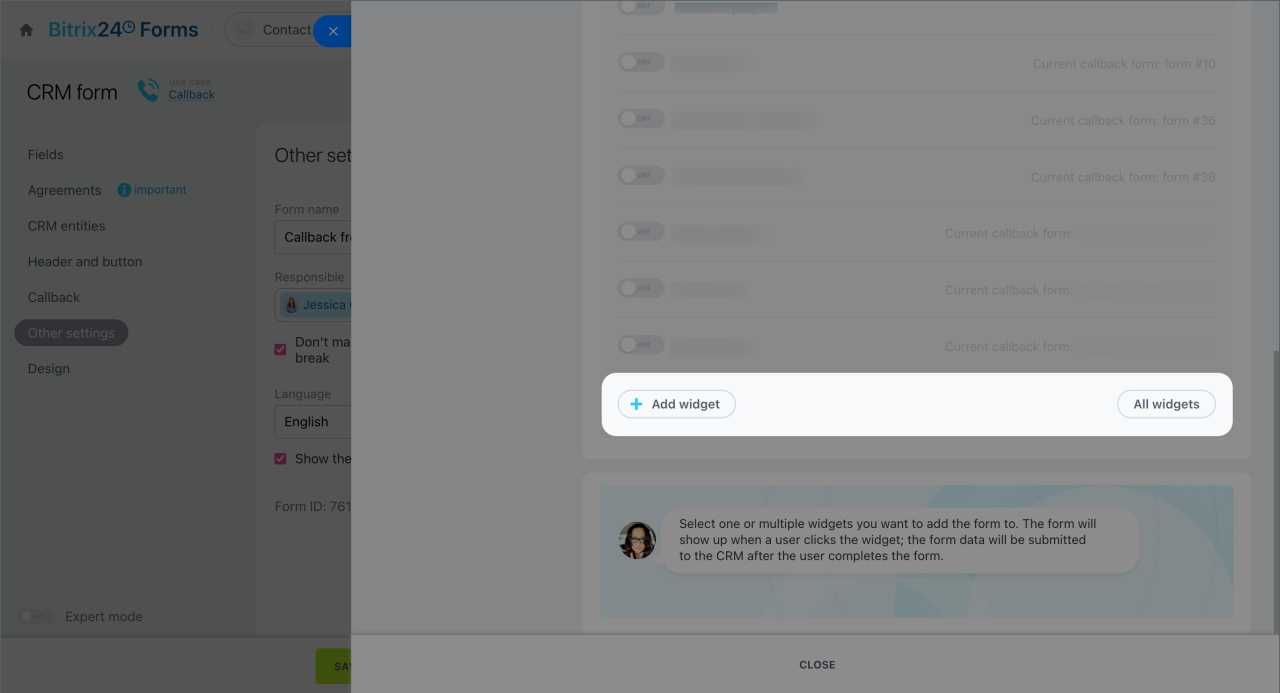 - Only Bitrix24 administrators and employees with permissions to edit CRM forms can create a callback form.