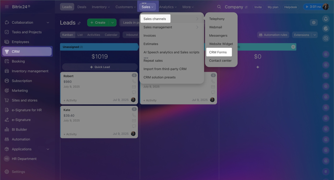 1. Go to CRM > Sales > Sales Channels > CRM forms.