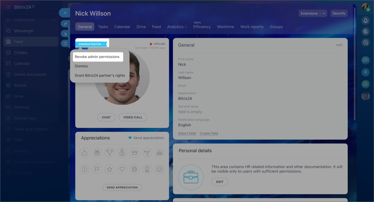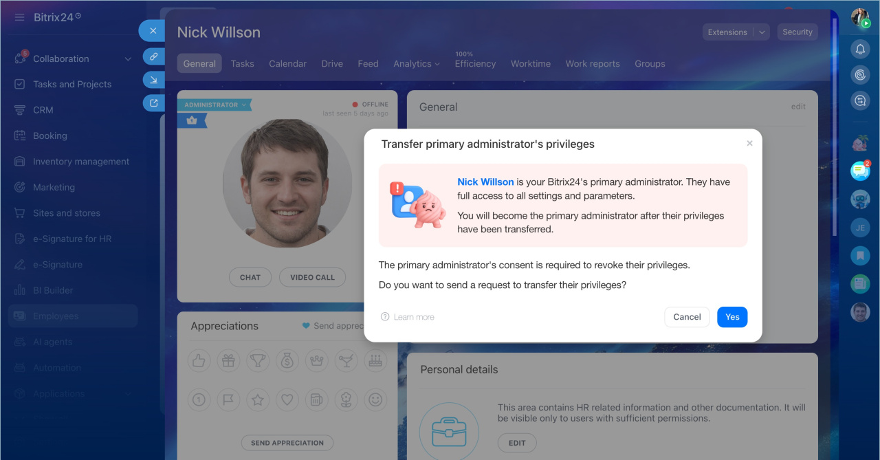 If this employee leaves the company or is no longer responsible for managing Bitrix24, the rights should be transferred to another user. Only another user with administrator rights can perform this action.