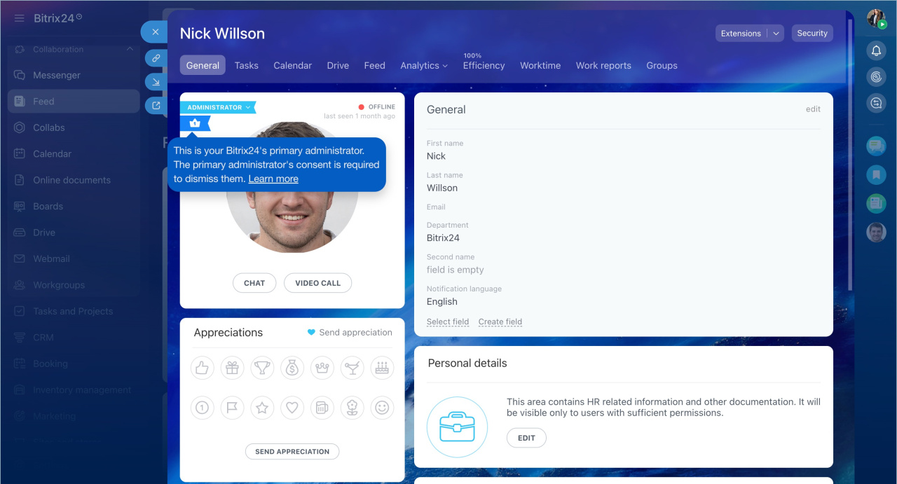 The primary administrator is the employee who created your Bitrix24 account. This person receives system notifications like plan renewal, news, and webinar invitations.
