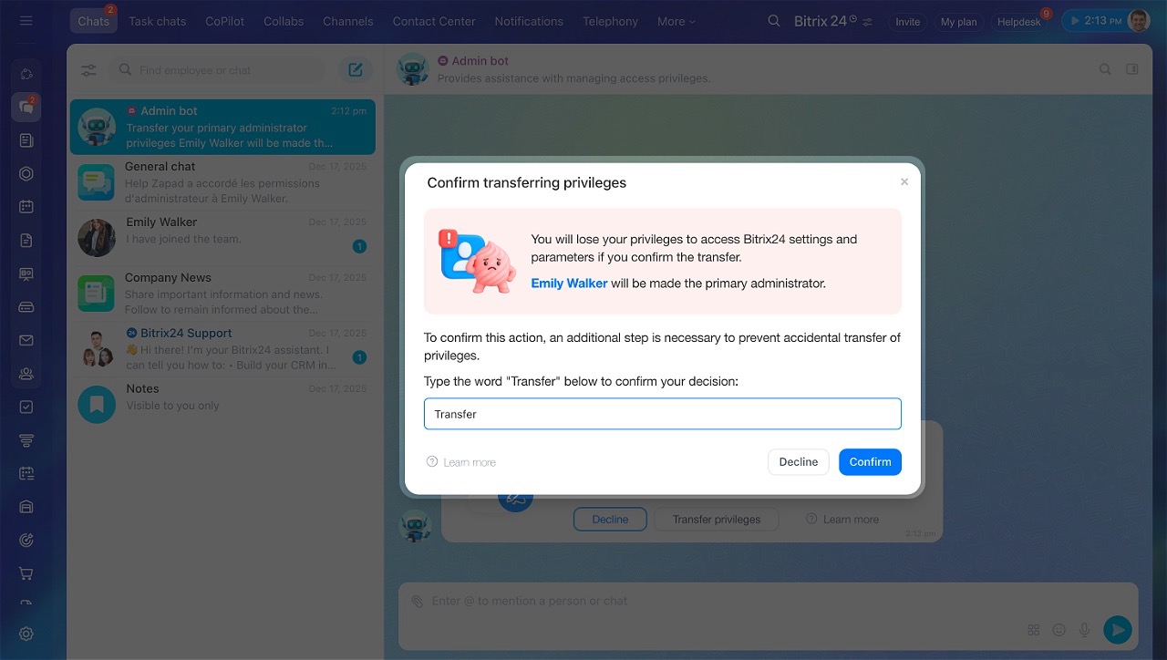 - The process of transferring rights and dismissing the primary administrator is the same. The difference is that after dismissal, they will no longer be able to access your Bitrix24 account.