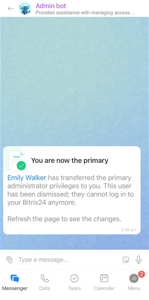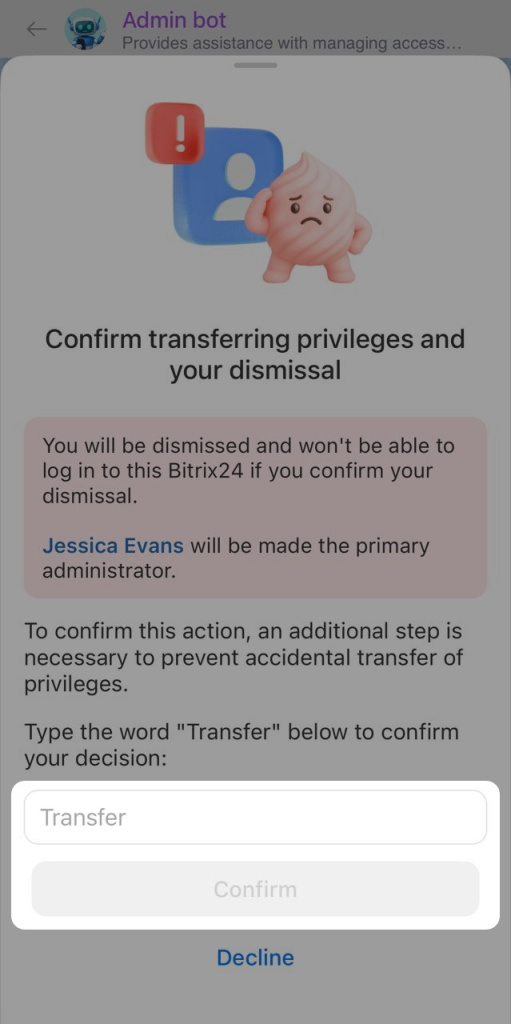 If the administrator confirms their dismissal, the new primary administrator will receive a message from the Admin Bot.