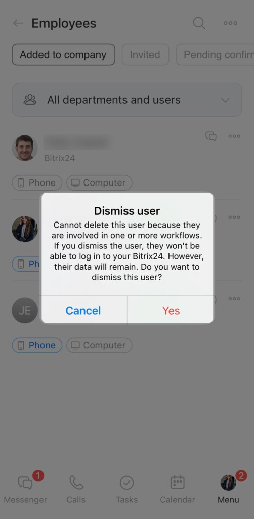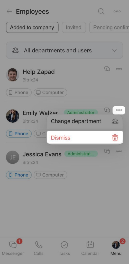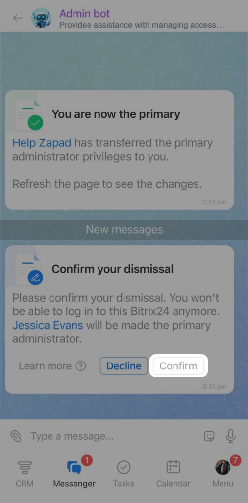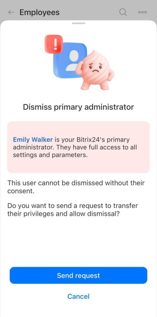 To protect Bitrix24 from accidental ownership changes, dismissing the primary administrator requires the confirmation.