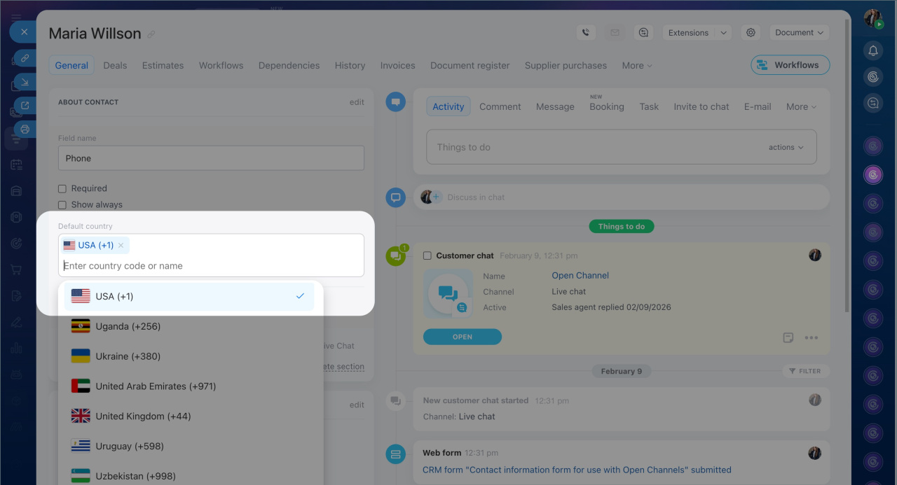 - If you rarely work with international clients, you can keep the default country and select a code directly in the Phone field of a specific form by clicking the flag.