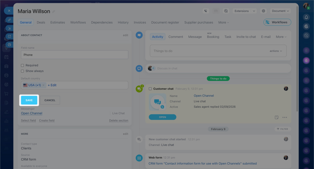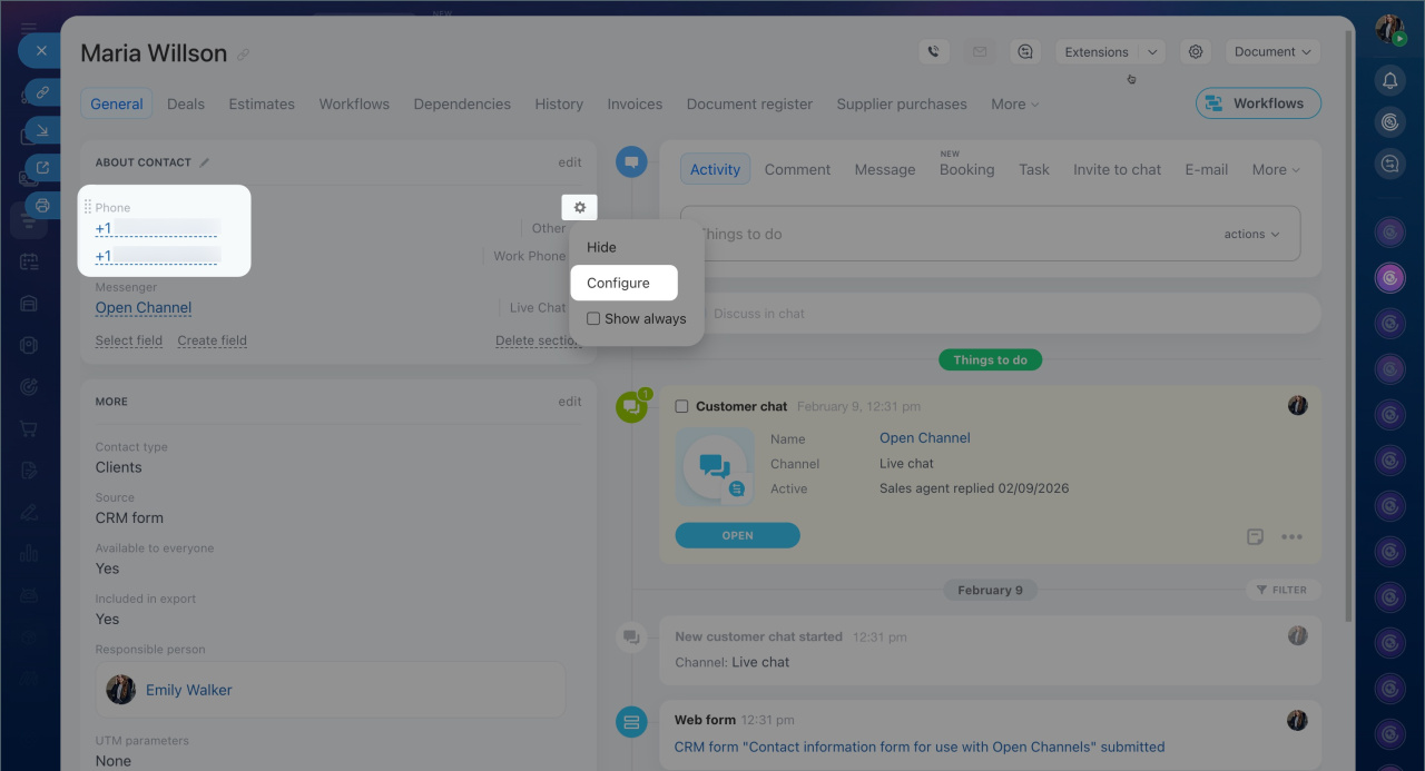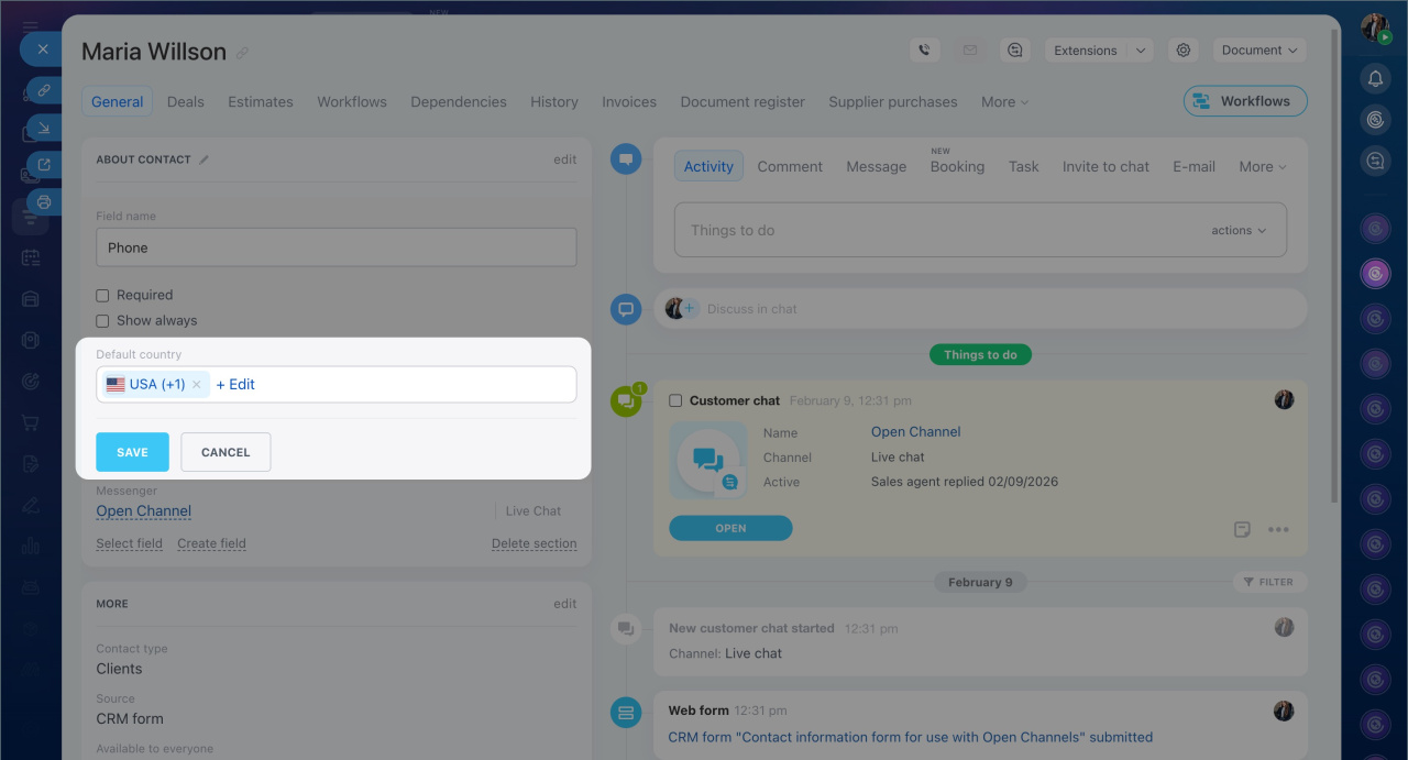 - Go to CRM > Customers > Contacts or Companies and open the required form. Click Settings (⚙️) next to the Phone field and select Configure. In the Default country parameter, choose a country or select No default country. Save the changes.