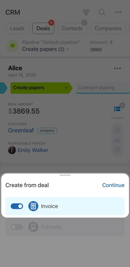 From a deal or estimate form. This method is suitable if you are managing a deal and want to issue an invoice immediately after agreeing with the customer. For example, after a call, you record the amount in the deal and want to issue the invoice right away.