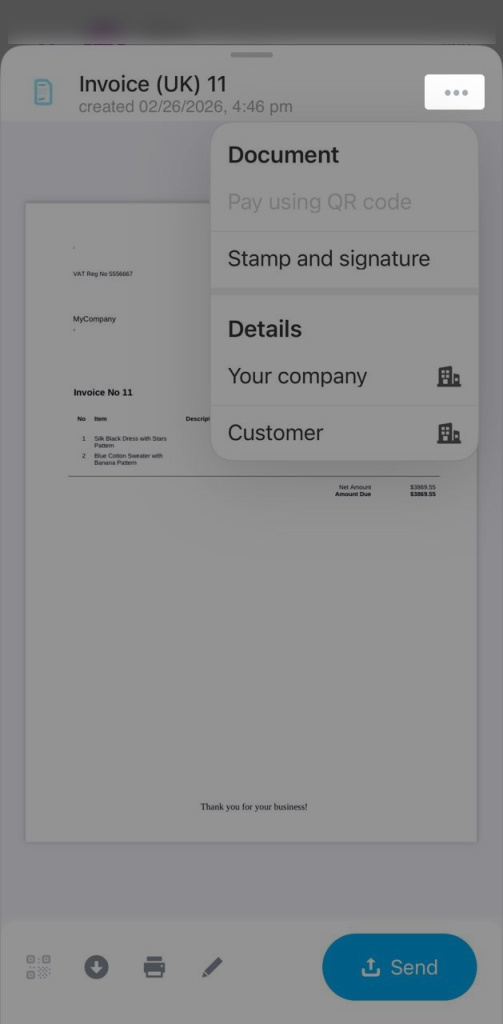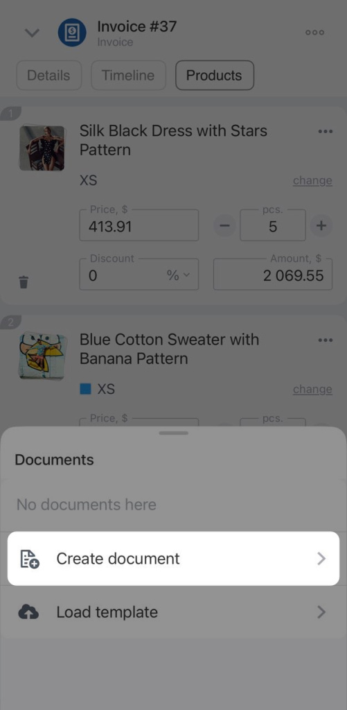 To create a document, in the invoice form, click Three dots (...) > Documents > Create document and select the required template. A new template can only be uploaded in Bitrix24 on a computer.