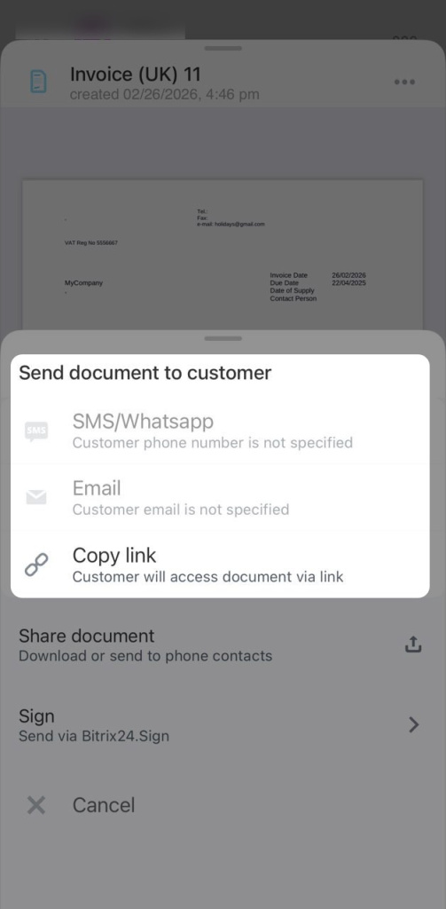 - Via SMS — if an SMS provider is connected and the customer's phone number is specified. The customer will receive a link to the document.