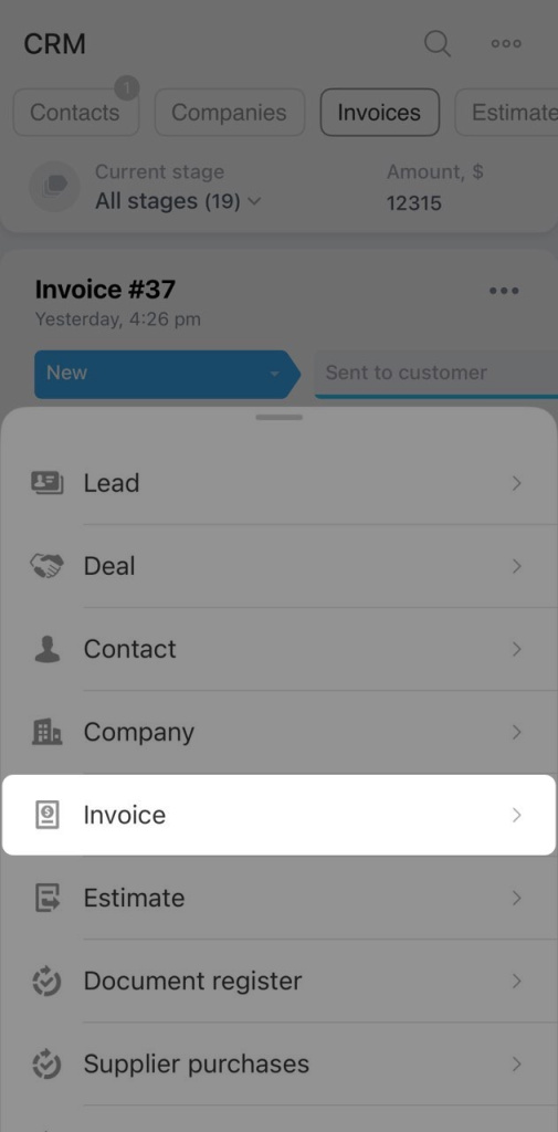 You can create an invoice based on CRM items, such as deals and estimates, or directly from the Invoices section.