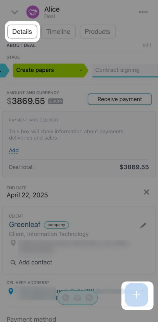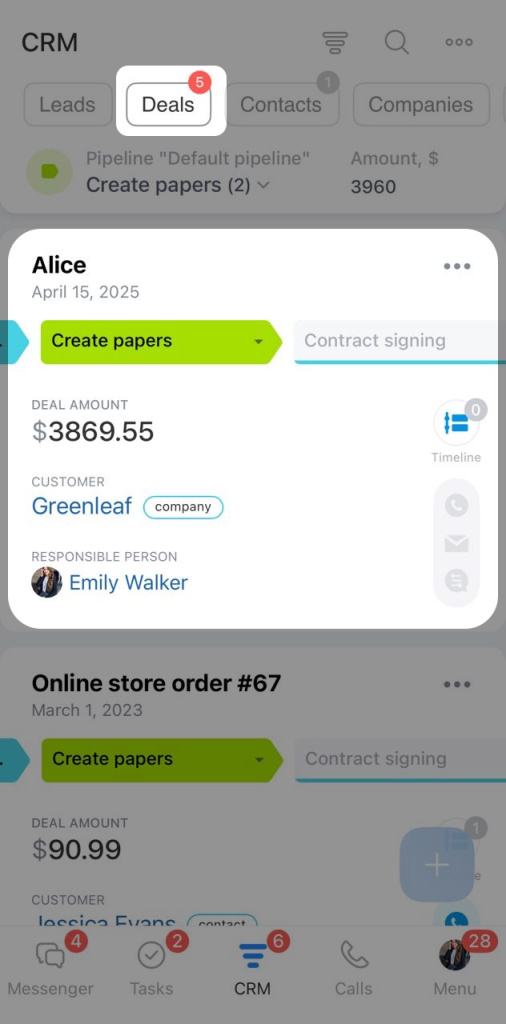 - To create an element based on another in the mobile app, go to CRM > Deals, open the desired deal, tap Plus (+) in the bottom-right corner, tap Create from, and select the element.