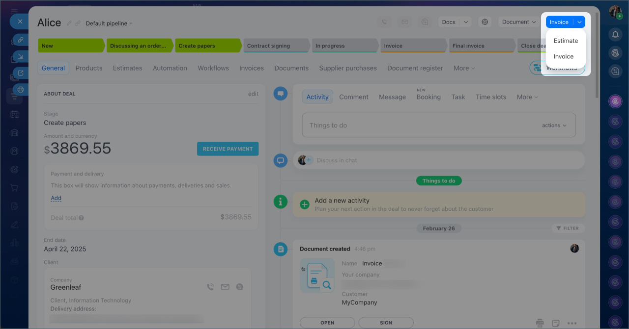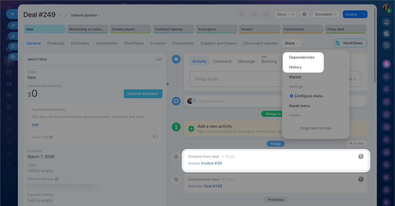 For example, let's see how to create an invoice based on a deal. These steps apply to other elements as well.