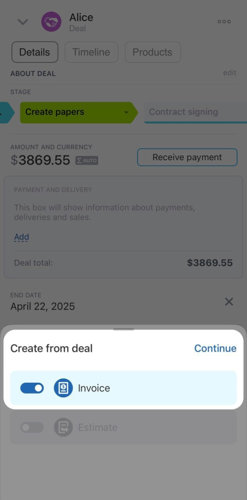 3. Select Create from > Invoice and tap Continue. If the original element contains custom fields not present in the new element, you will be prompted to create similar fields. Activate the toggle next to the element if you want to create the fields, and tap Continue. An invoice will be created based on the deal, and its form will open.