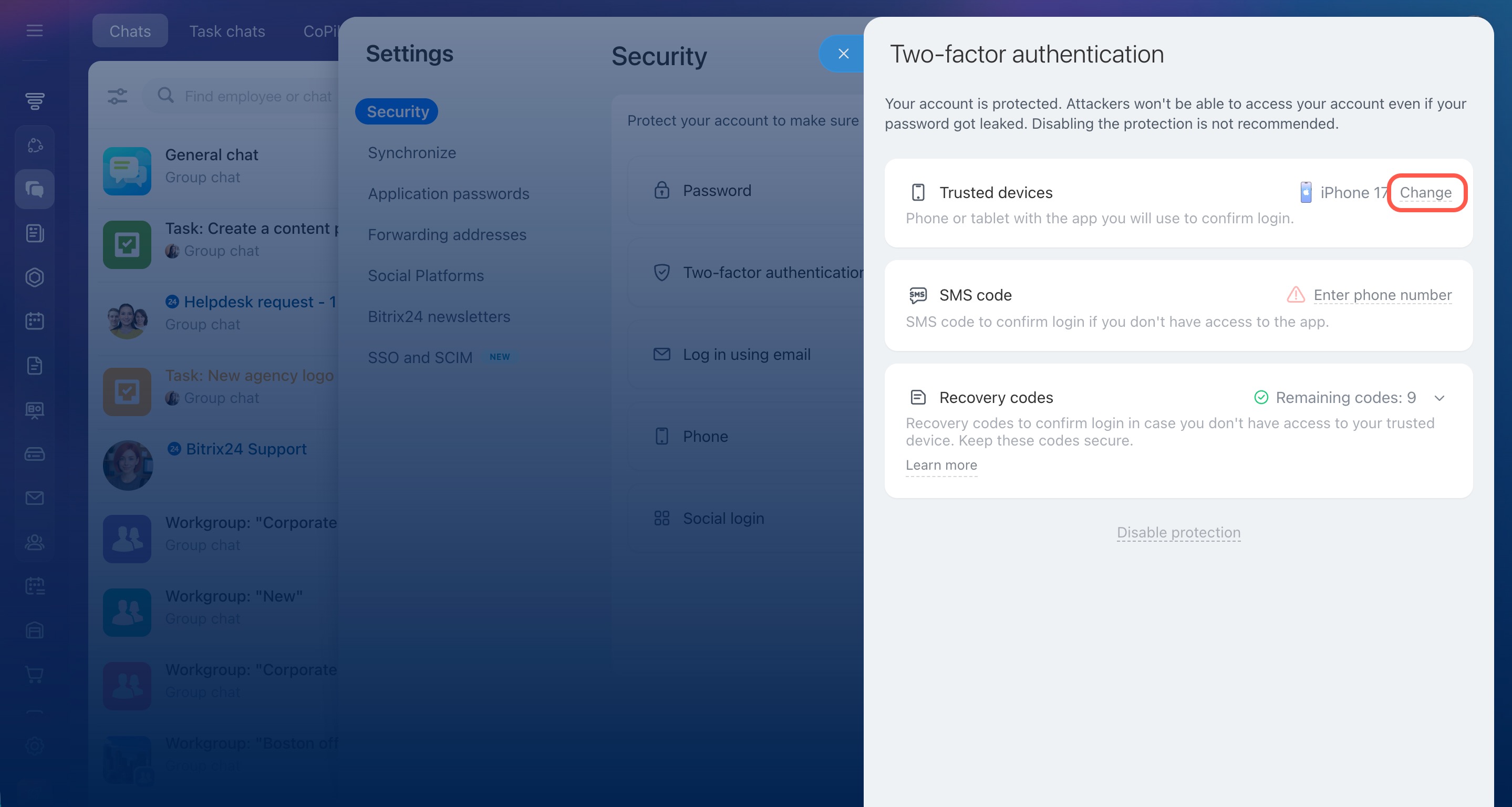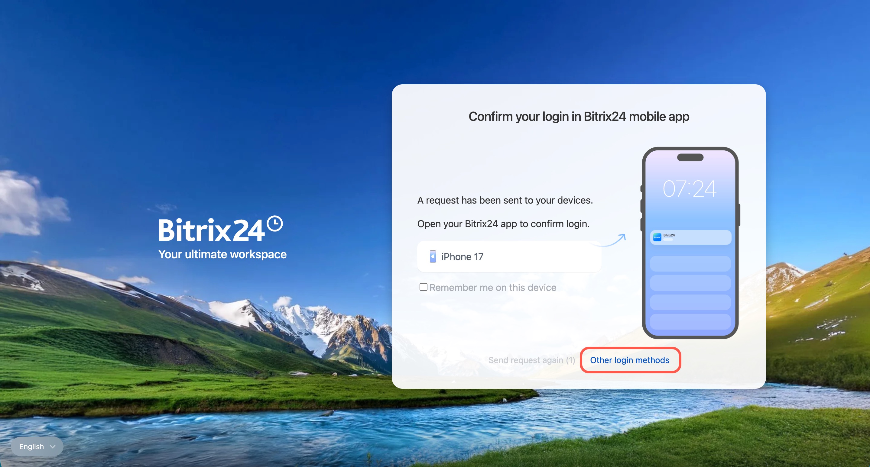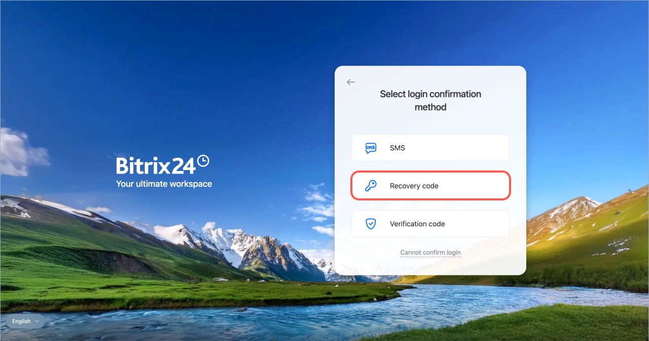 If the new two-factor authentication is enabled, confirm your login using the Bitrix24 mobile app. If your phone is lost, you changed devices, or the app is unavailable, restore access using alternative methods.