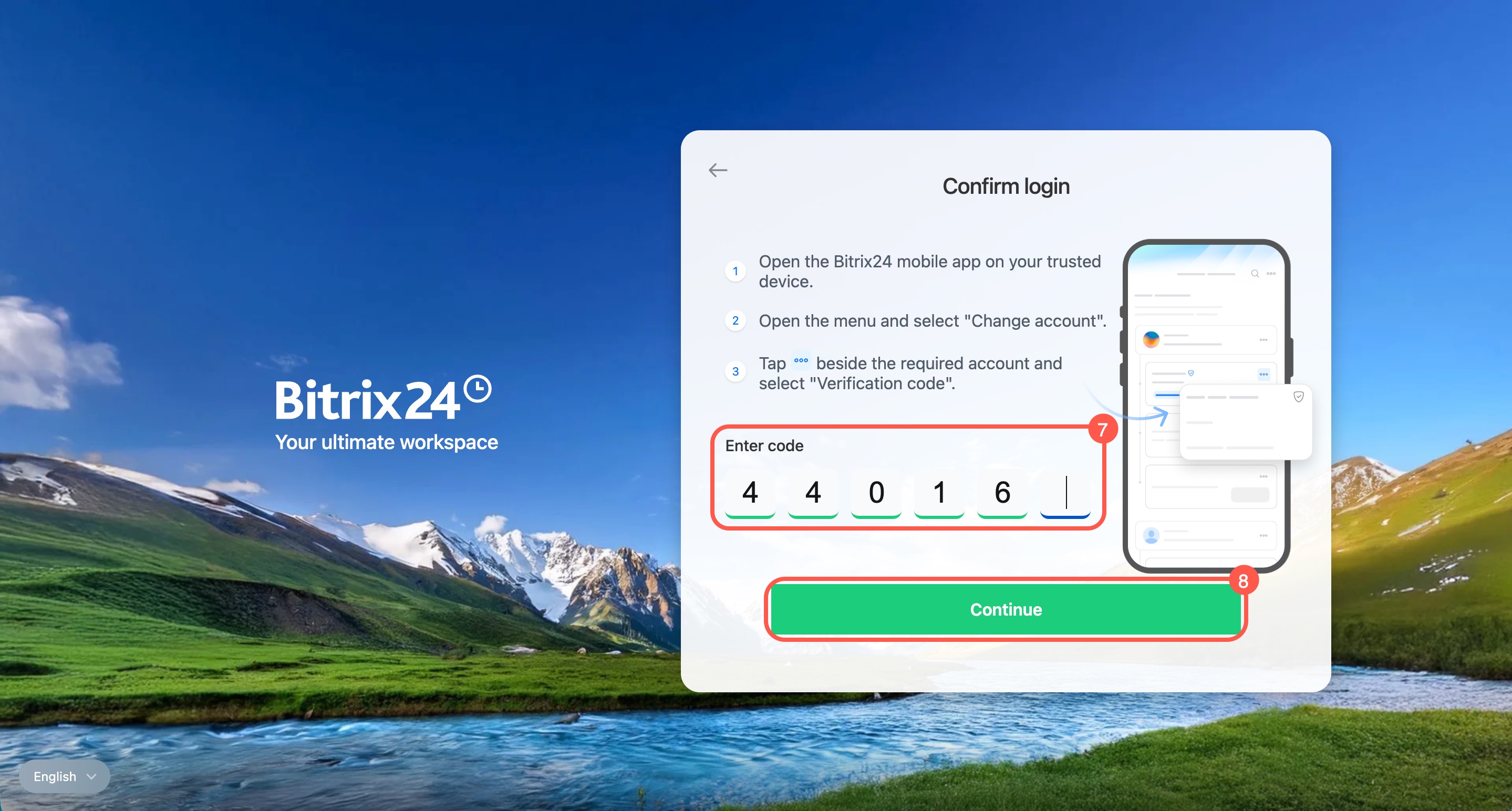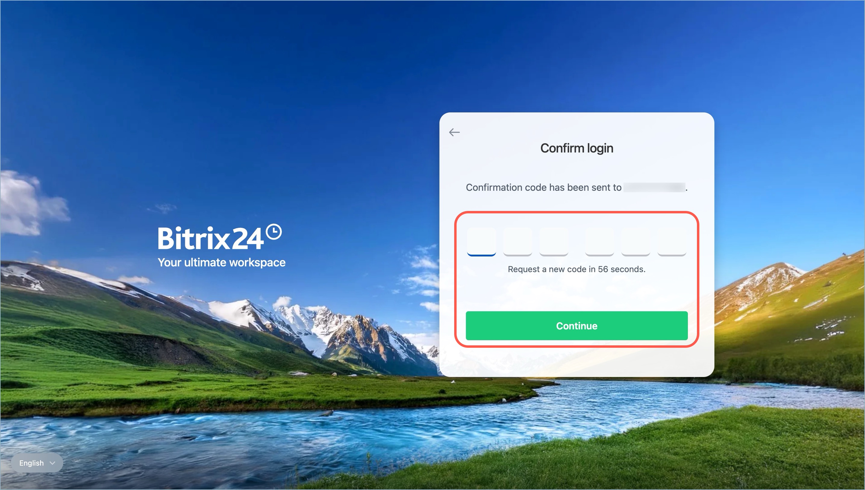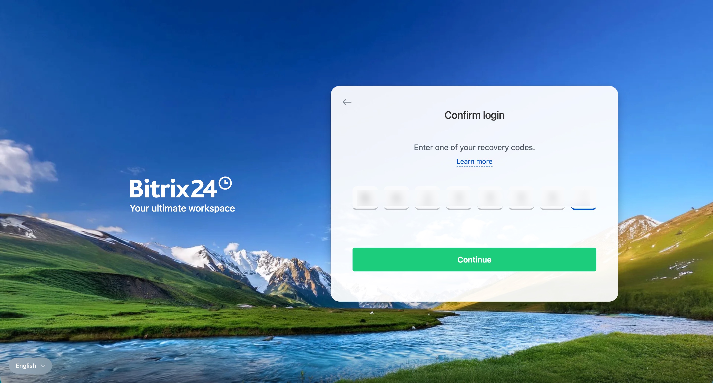 - Enter the code in Bitrix24 on your computer and click Continue. If the code is correct, you will be logged in.