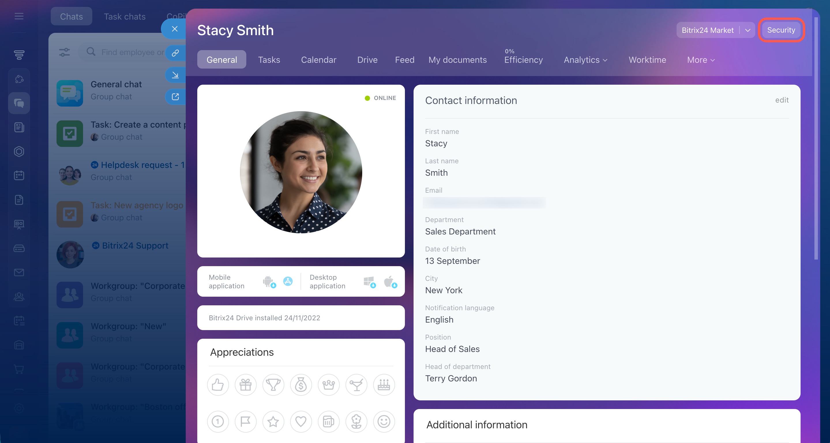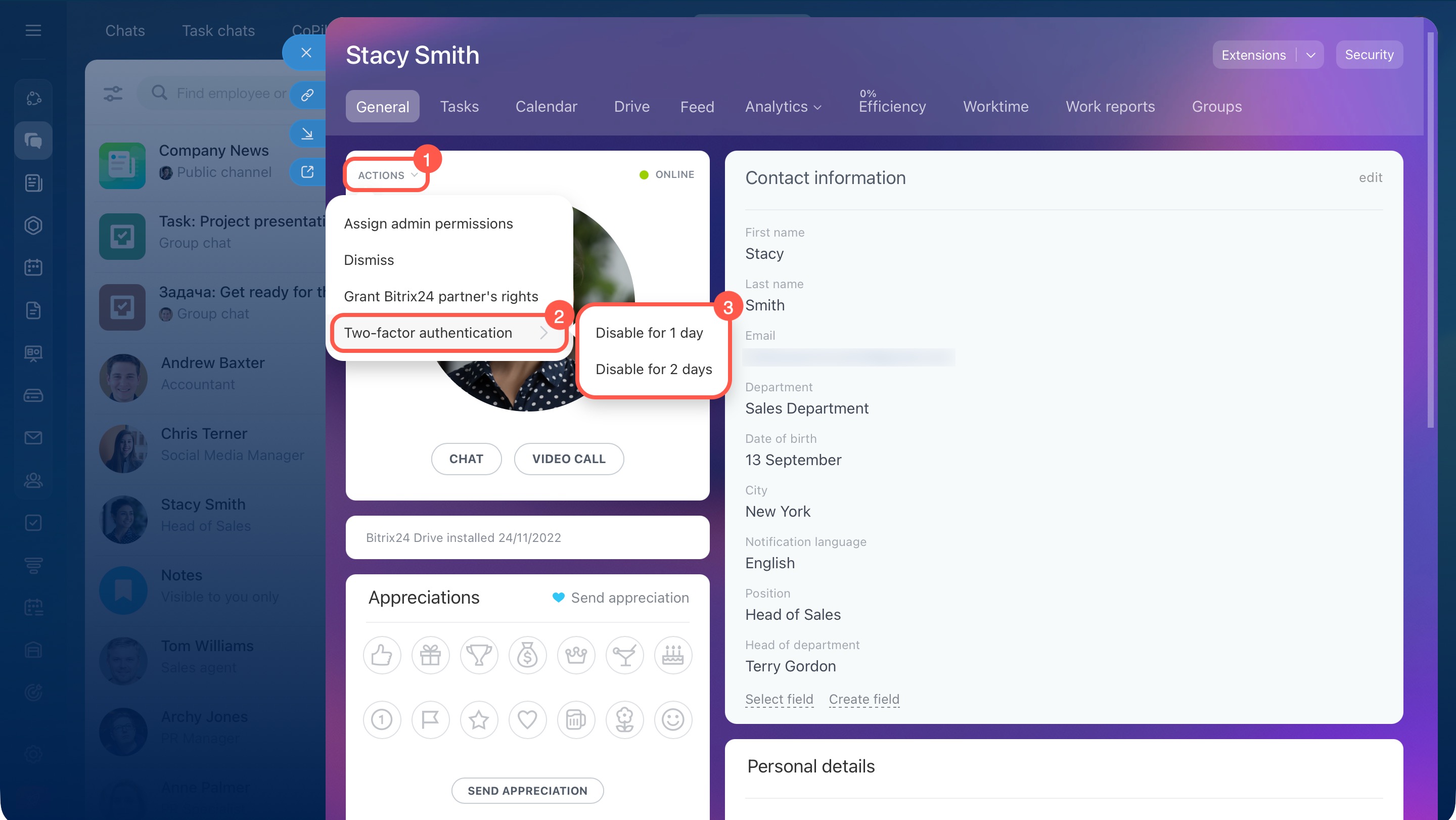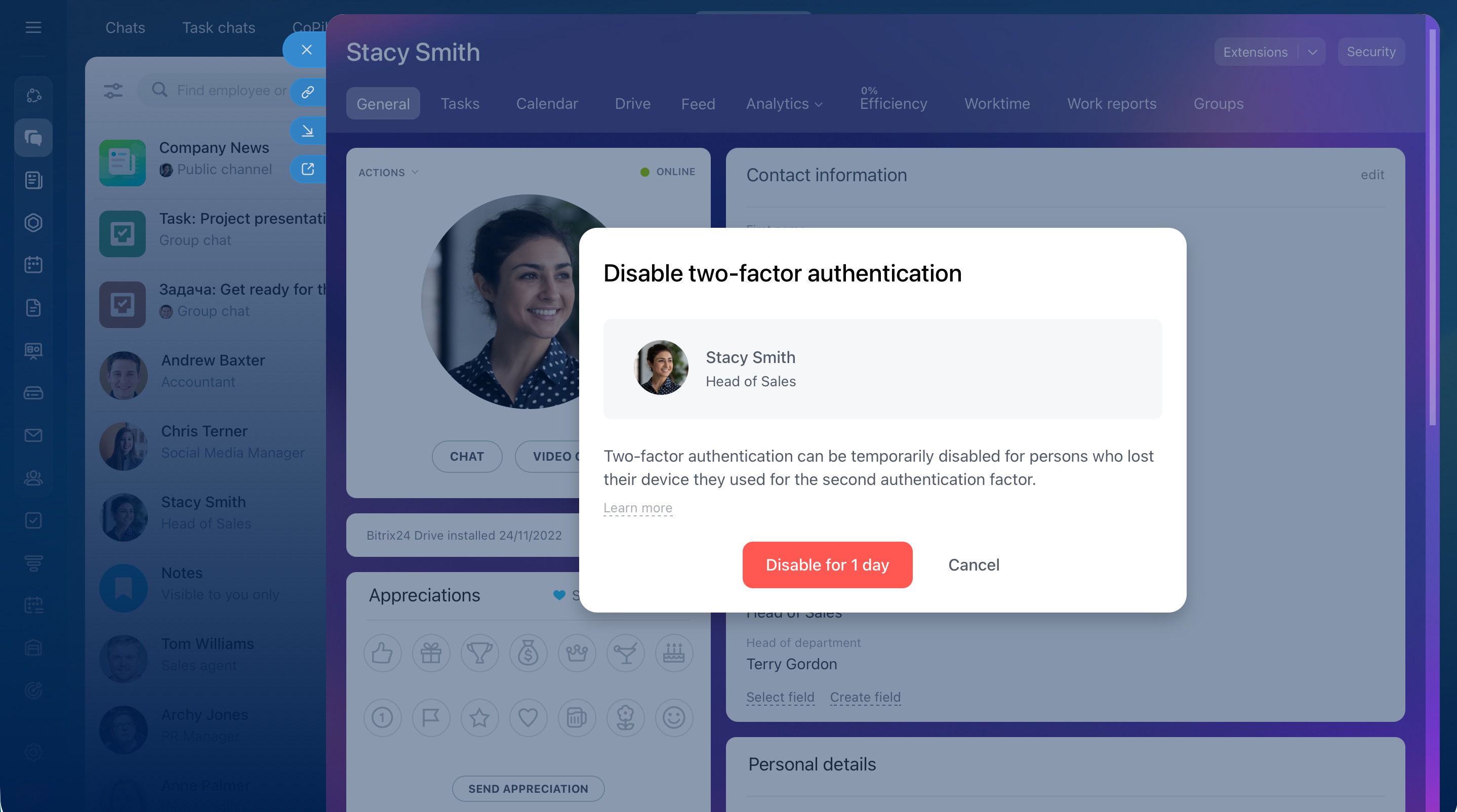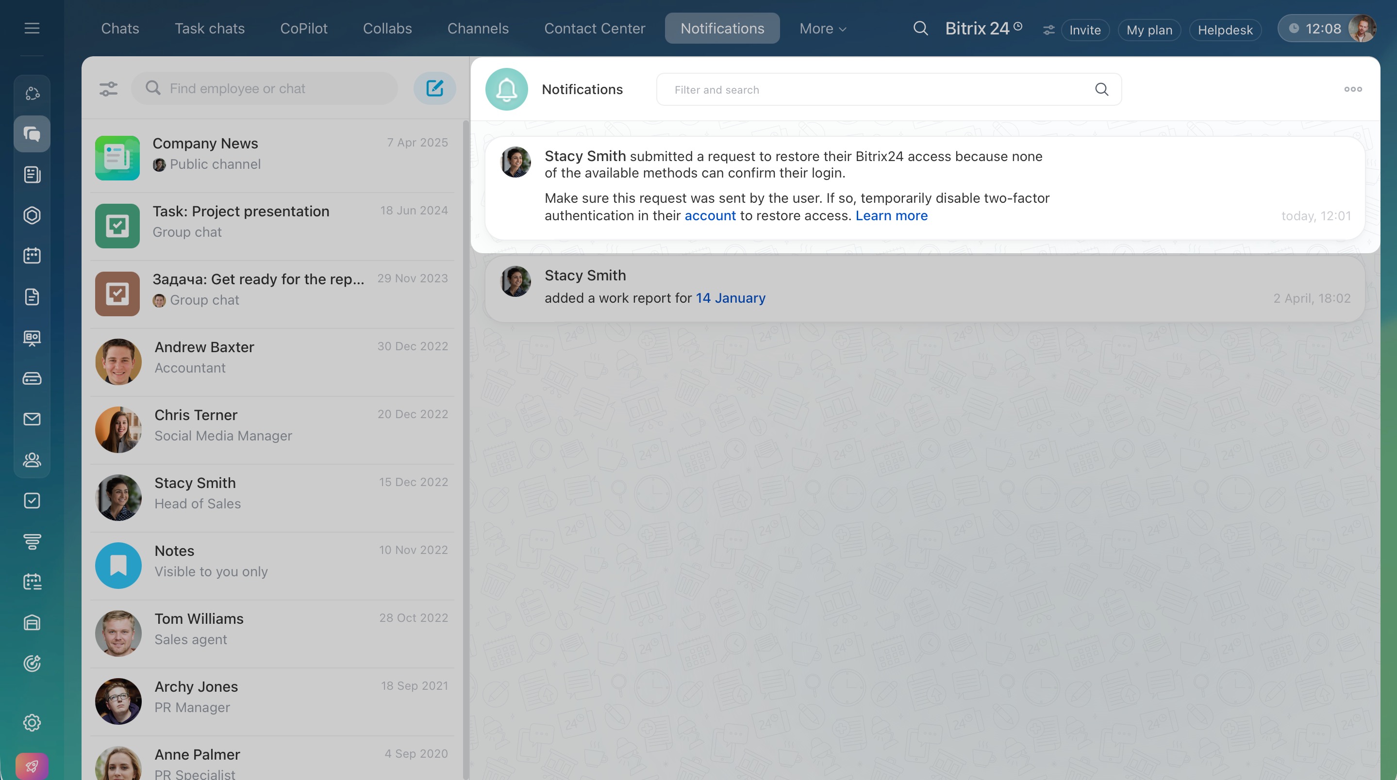 A notification appears in Bitrix24. Make sure the request is legitimate. Contact the employee using any available communication channel.