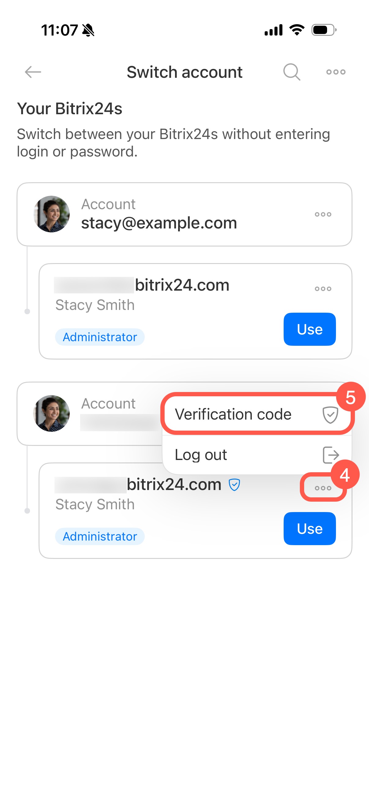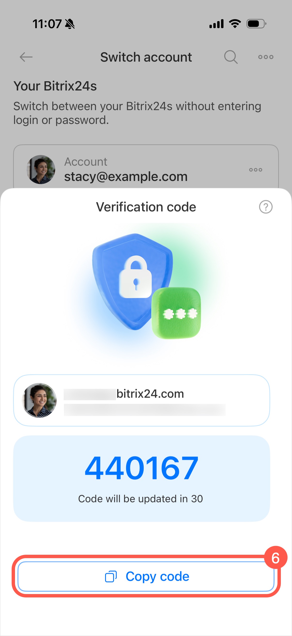 - Click Verification code. Bitrix24 generates a code and sends it to the mobile app.