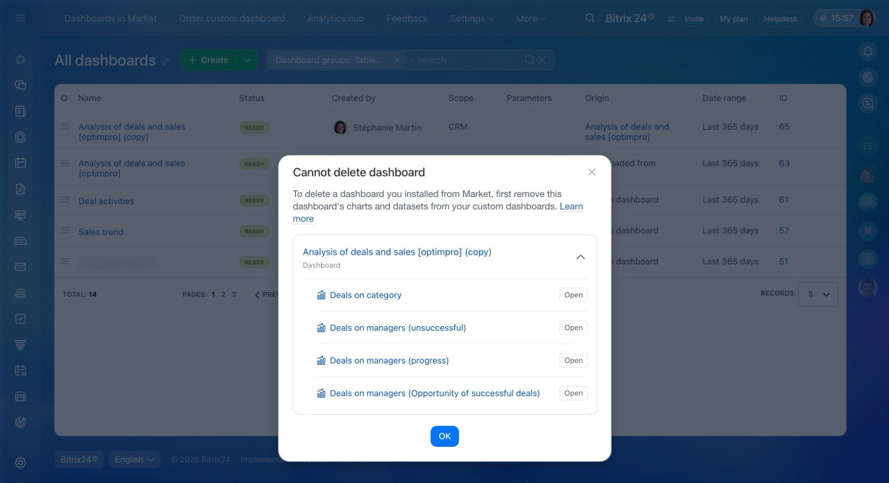 Bitrix24 shows the linked elements. For example, a chart or dataset used in another dashboard. Open that dashboard, delete the elements, and save the changes.