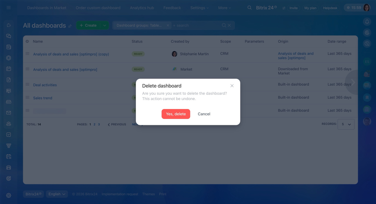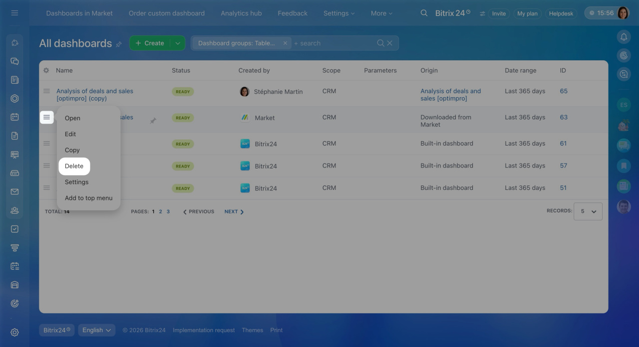 - Delete dashboards installed from the Bitrix24 Marketplace using the action menu in BI Builder.