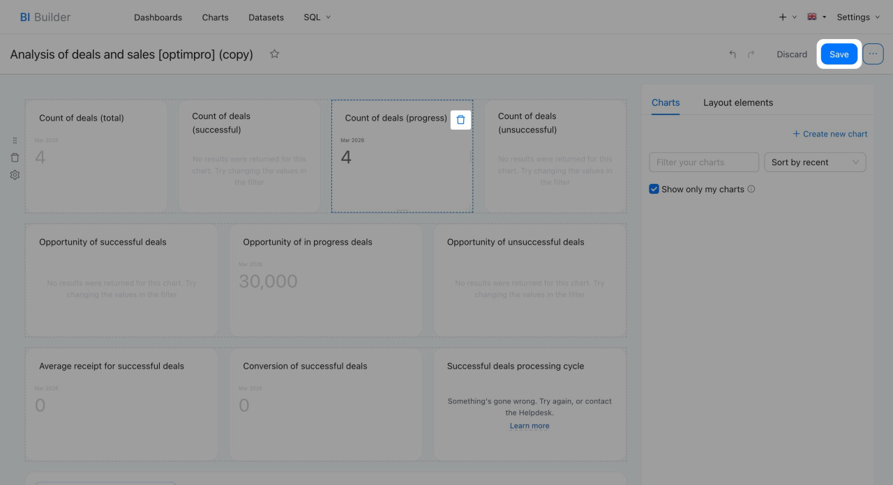Open the BI Builder section. Select the dashboard from the list and click