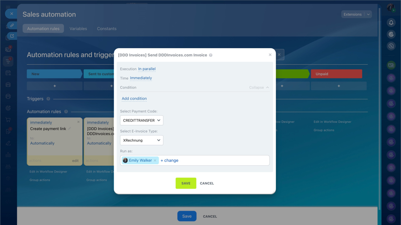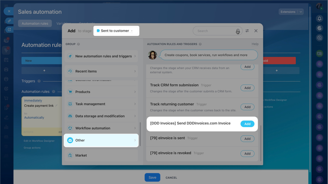 - You can send e-invoices automatically using automation rules. Select the DDD Invoices automation rule or trigger in the Other block.