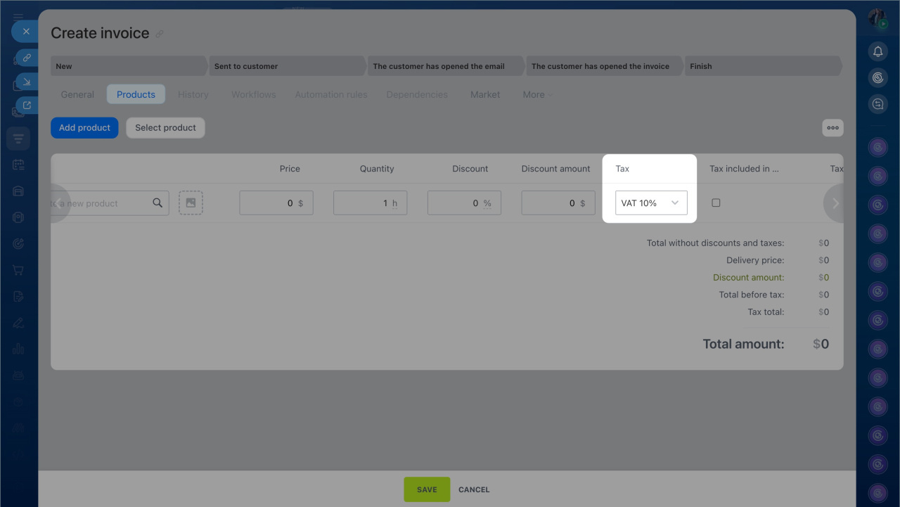 Configure a tax rate. Each e-invoice must be linked to the correct tax rate. Create the required tax rate in your Bitrix24 CRM settings before creating invoices.
