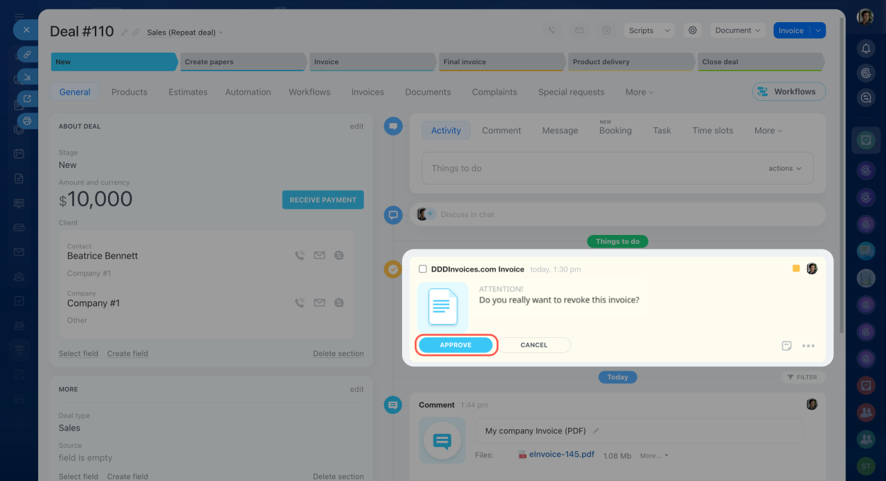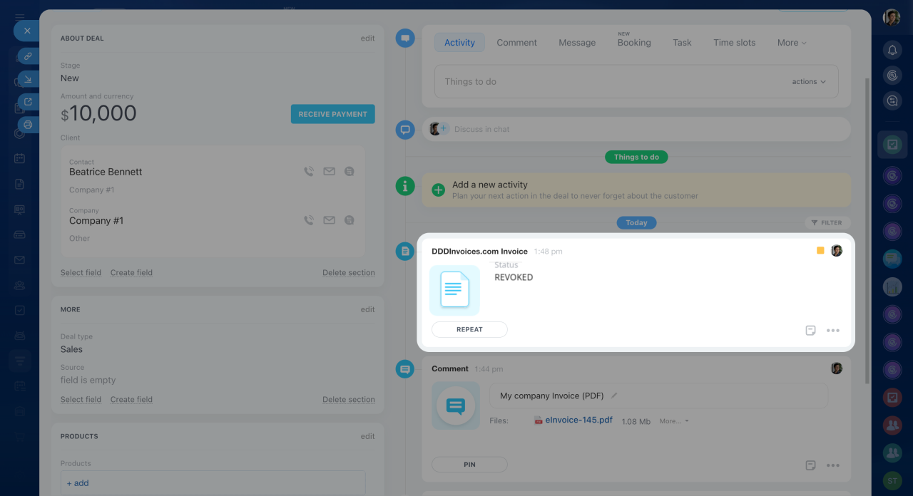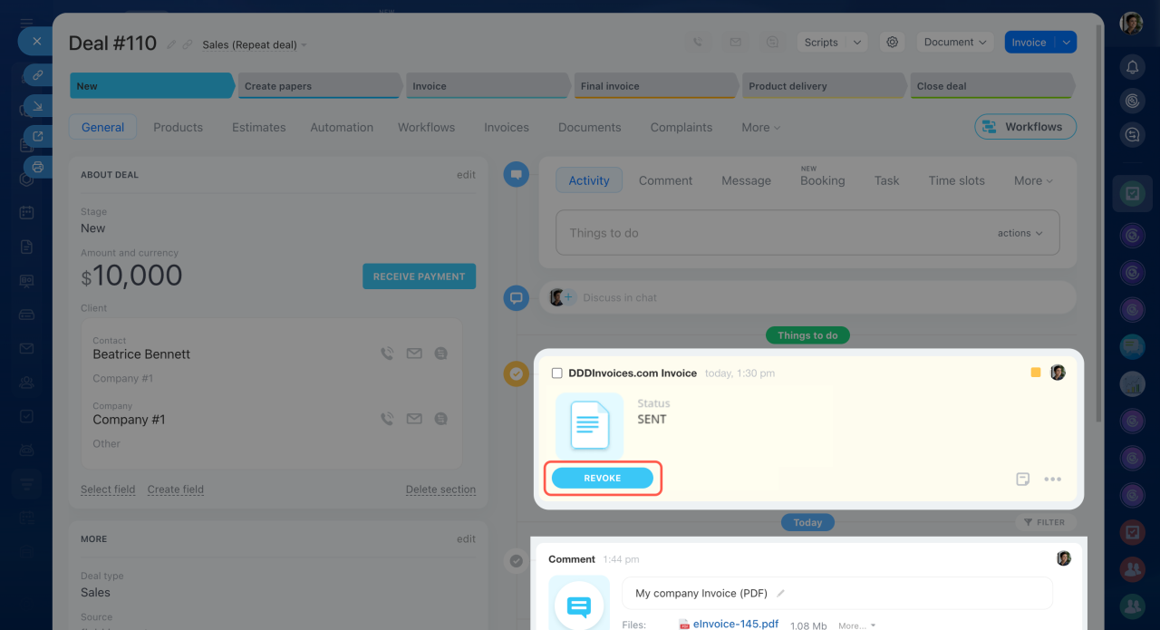 The Timeline shows an activity with the invoice status. A comment with the saved PDF invoice appears below. You can download and store the invoice on your computer if needed.