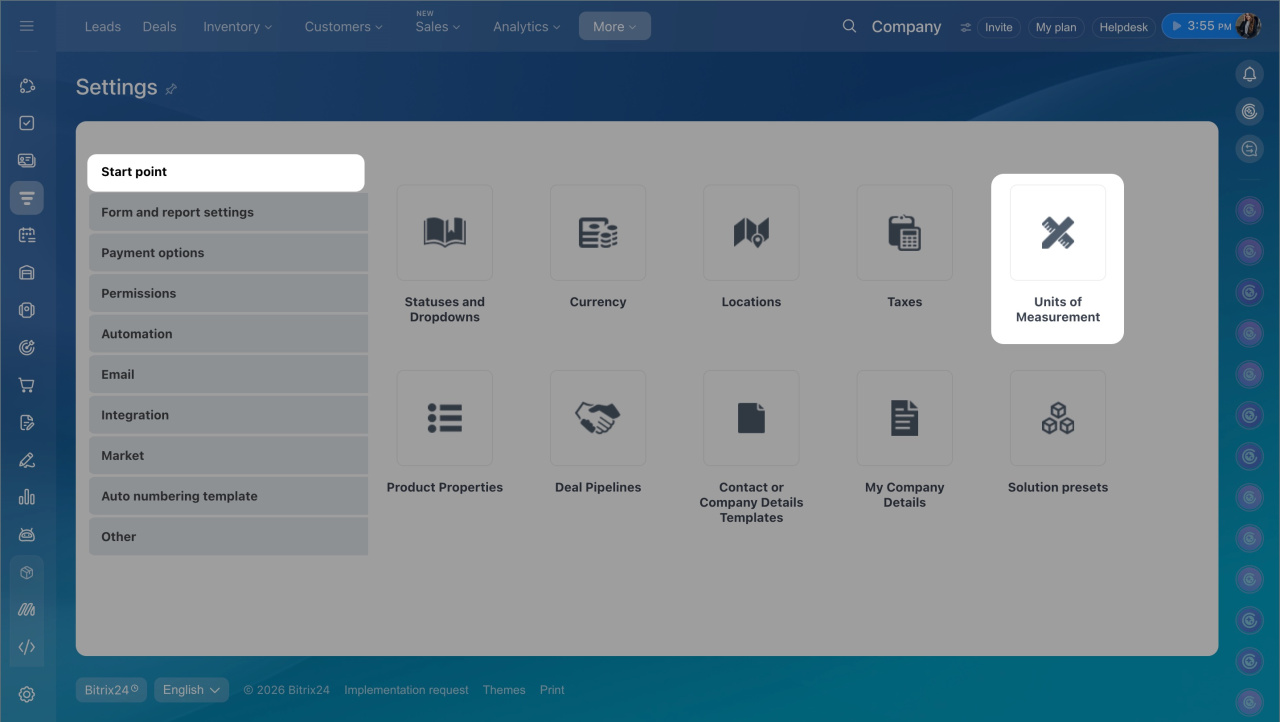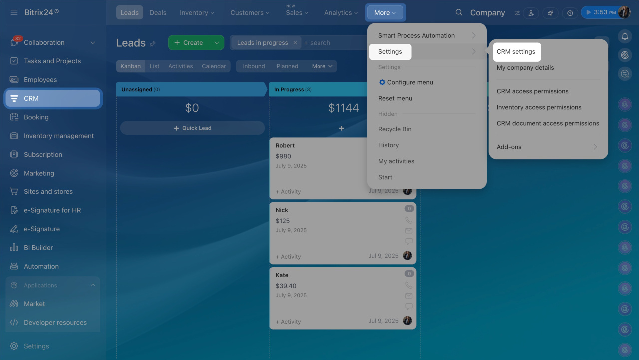 1. Go to CRM > Settings > CRM settings.