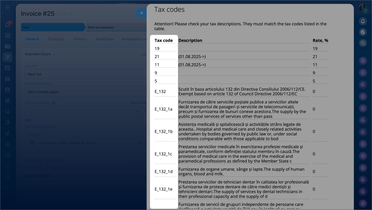 - Each e-invoice should be linked to the correct tax rate. Create the required tax rates in Bitrix24 CRM settings.