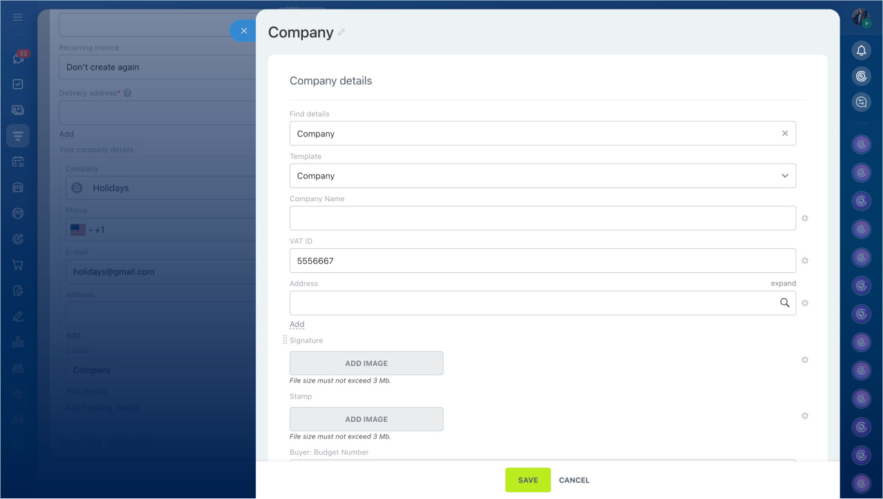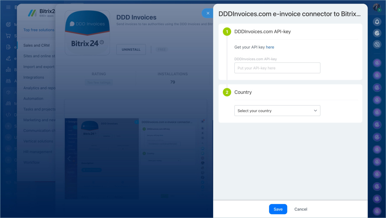 Send invoices directly to tax authorities using the DDD Invoices and Bitrix24 integration. After installing and configuring the app in your Bitrix24 account, you can issue compliant invoices on behalf of your company. The integration is designed only for B2B invoices to legal entities and B2G transactions with government authorities.