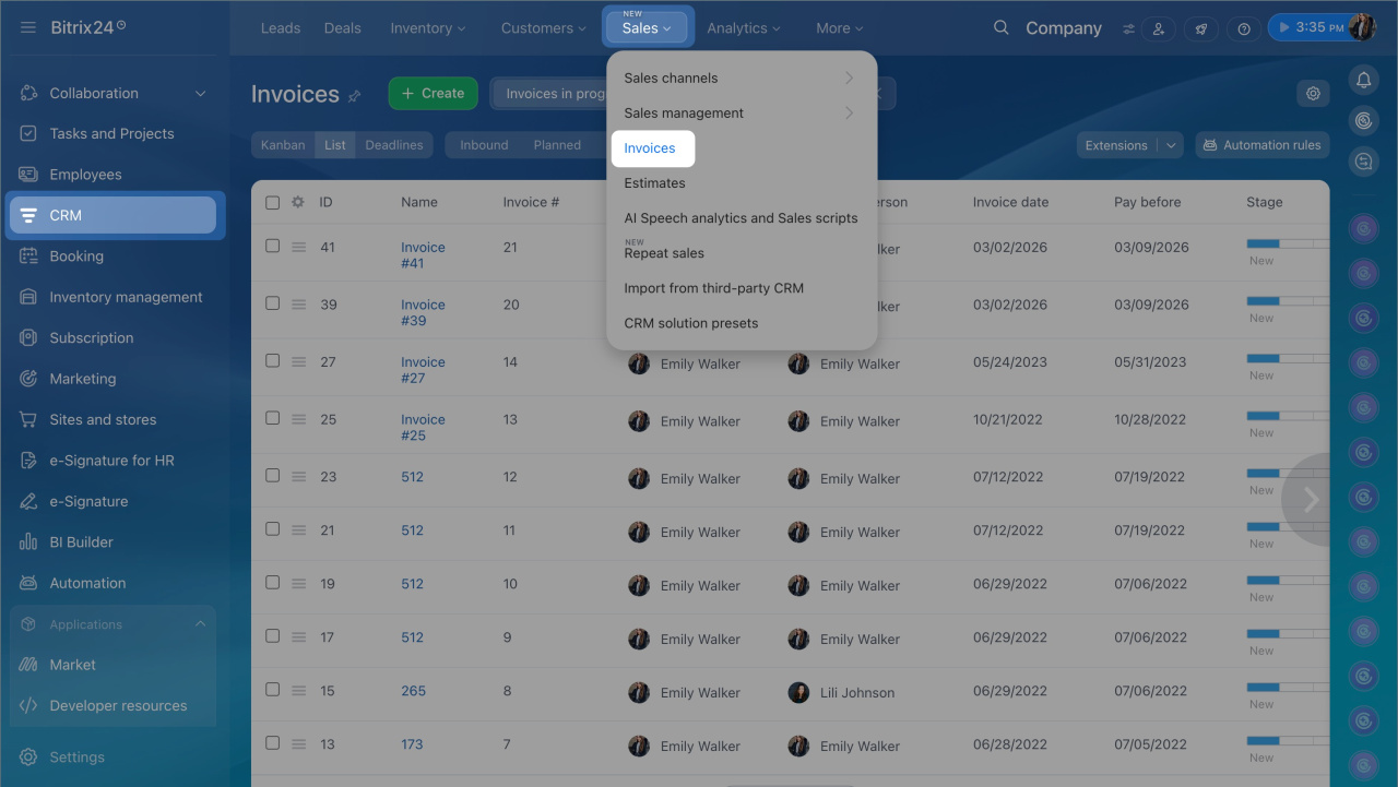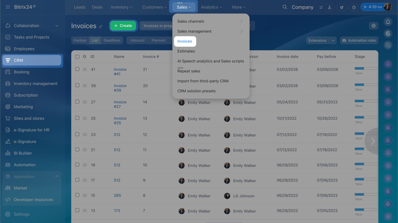 Go to CRM > Sales > Invoices and select the required invoice or create a new one by clicking the Create button.