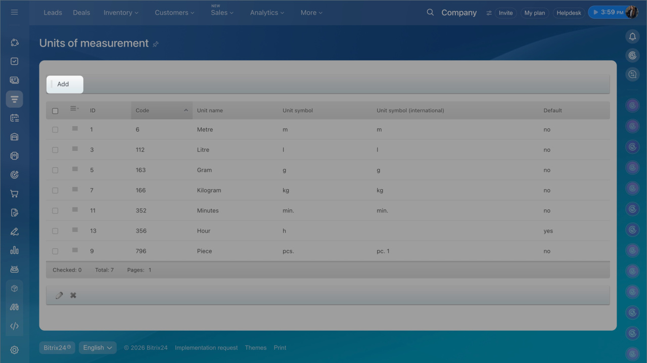 Configure units of measure. The symbol of each created unit must match the ItemUmcCode in your DDD account.