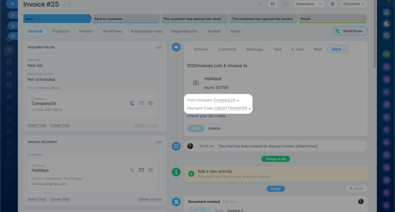 - To create and send an e-invoice, click DDD Invoices in the Timeline menu. Complete the required fields and click Send.