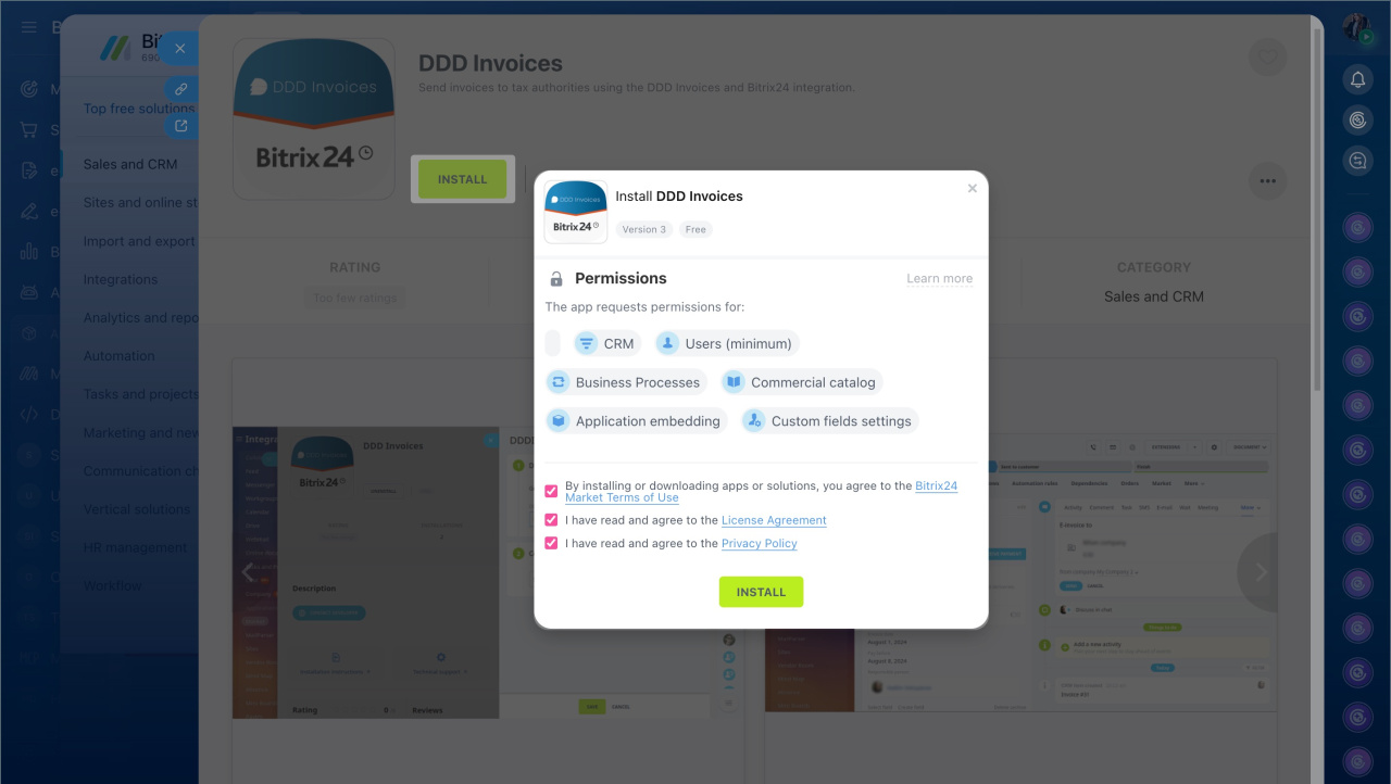 4. Review and accept the Bitrix24 Market Terms of Use, License Agreement, and Privacy Policy. Then click Install.