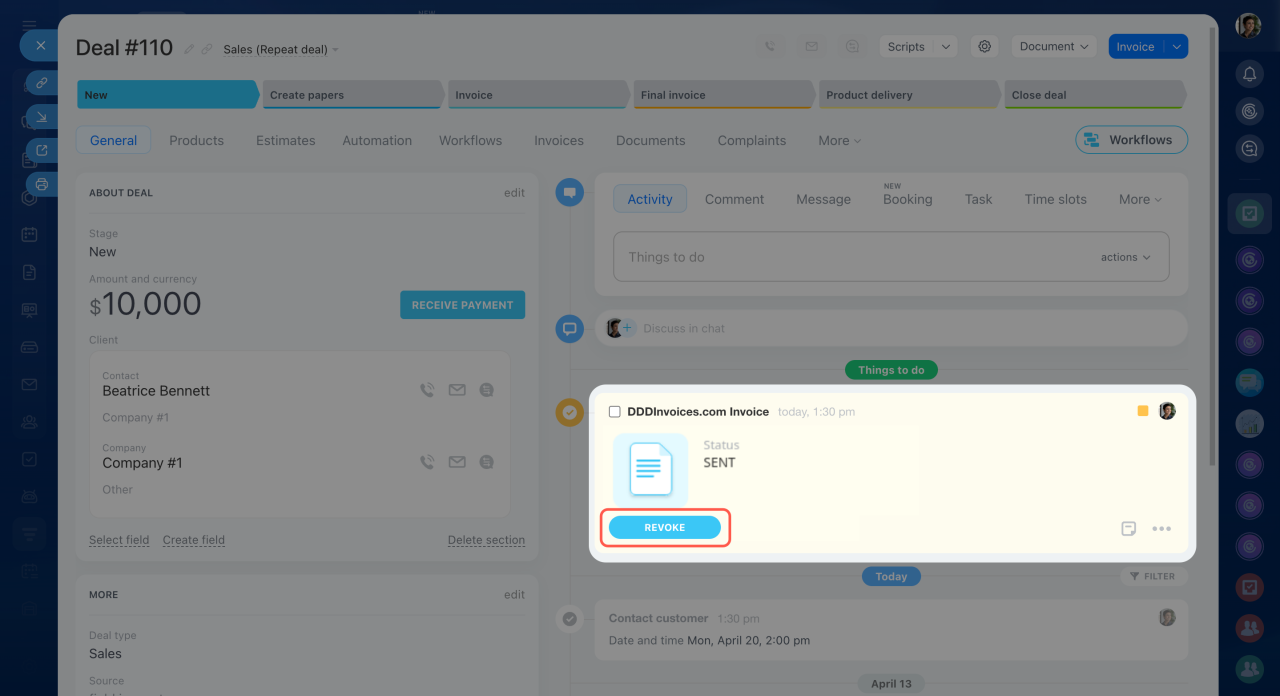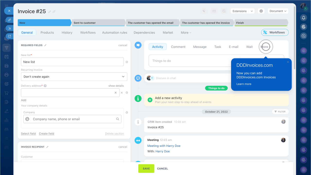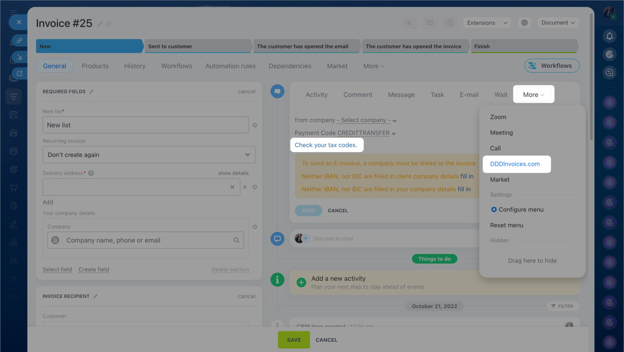 - Install the DDD Invoices app from the Bitrix24 Market. After installation, the DDD Invoices option appears in the Timeline of Bitrix24 invoices.