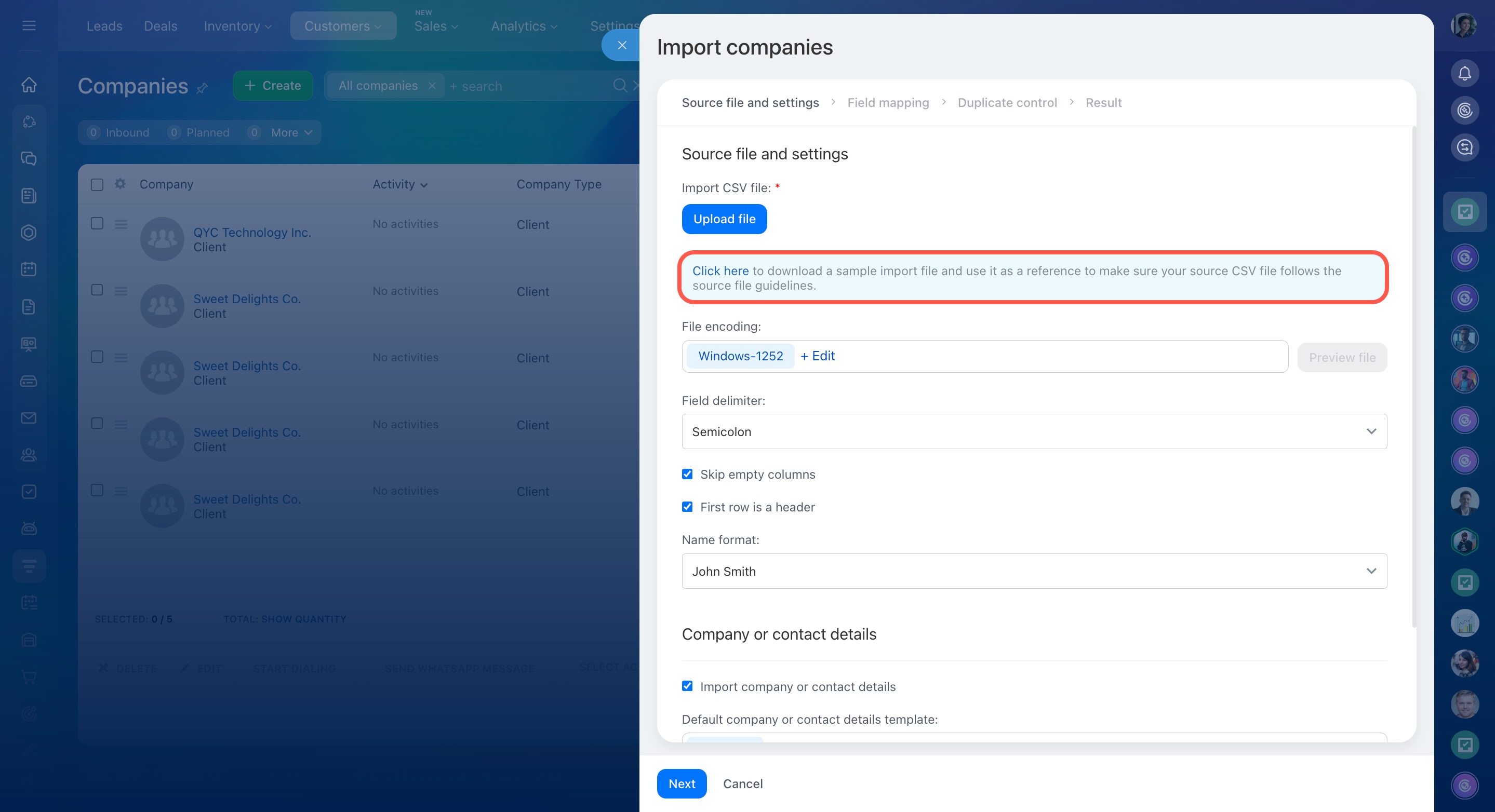 - Go to CRM > Customers > Companies. Click Settings (⚙️) and select Import companies.