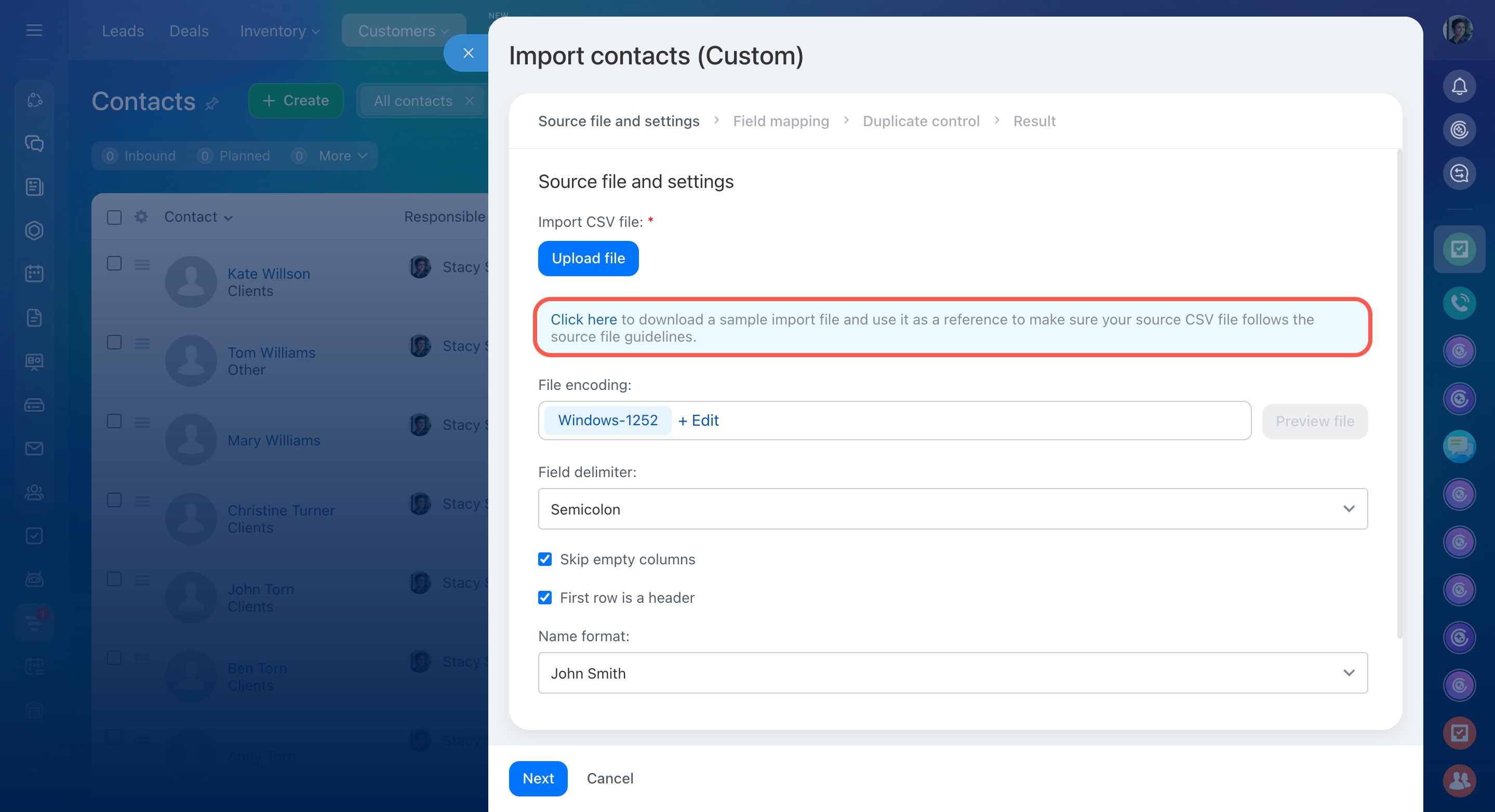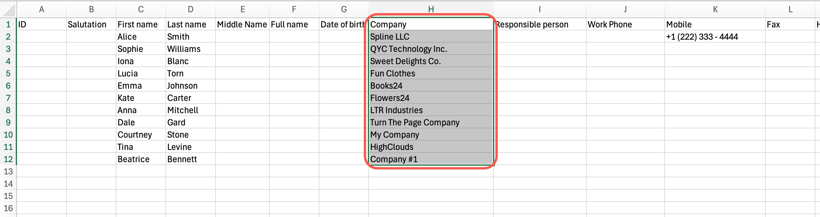 - Download the template and fill it in. In the Company field, enter the company names to link contacts. Upload the file to Bitrix24.