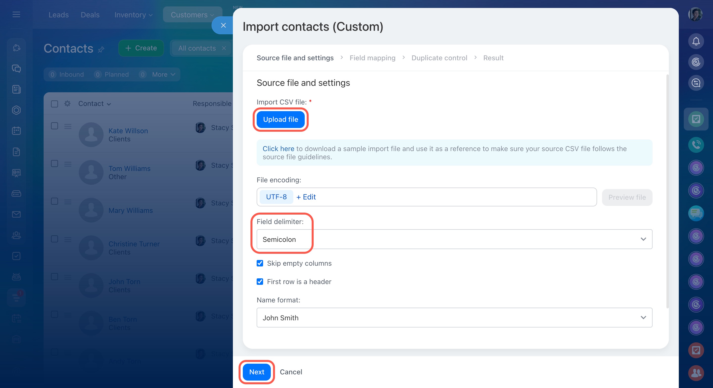 Choose how to handle duplicates and finish the import. To upload another file, click Import new file. Contacts appear under CRM > Customers > Contacts.