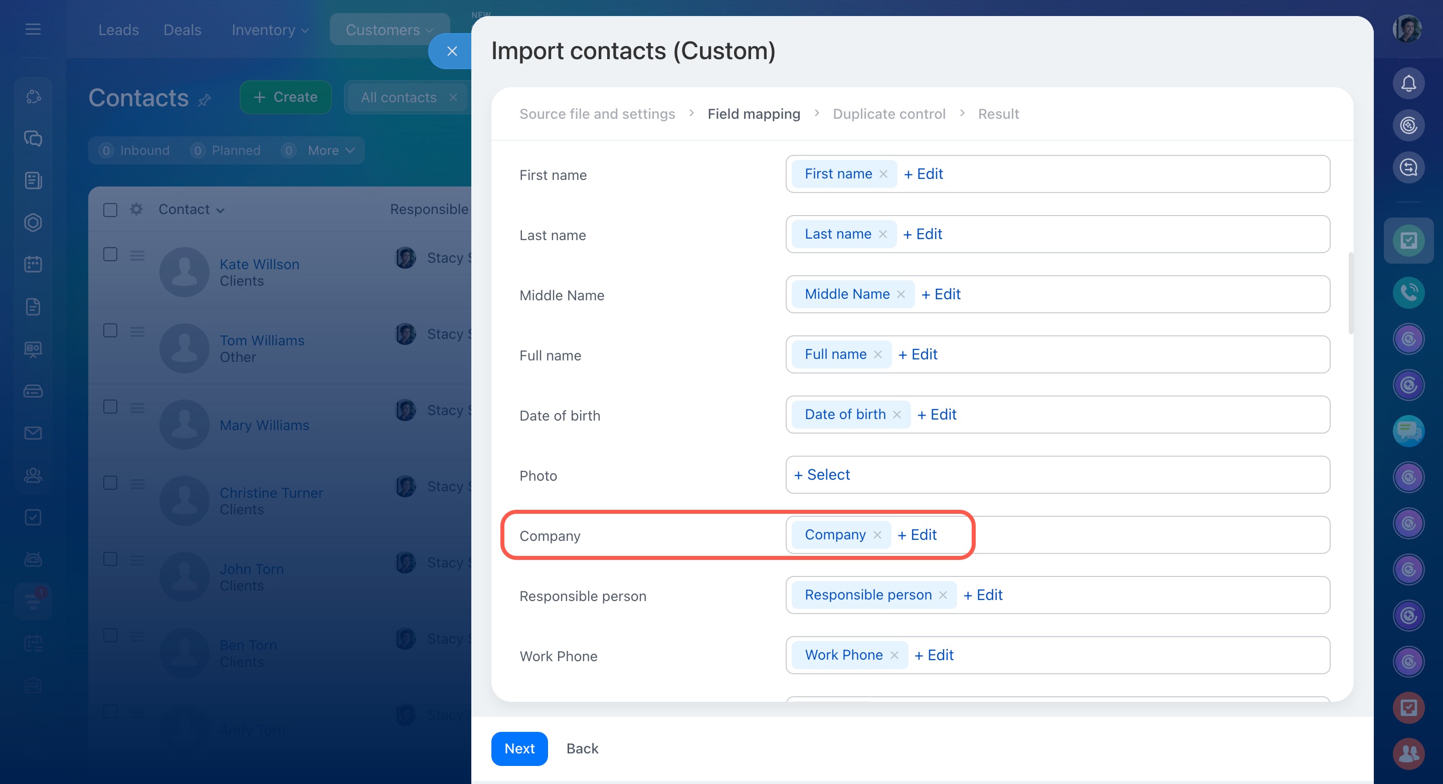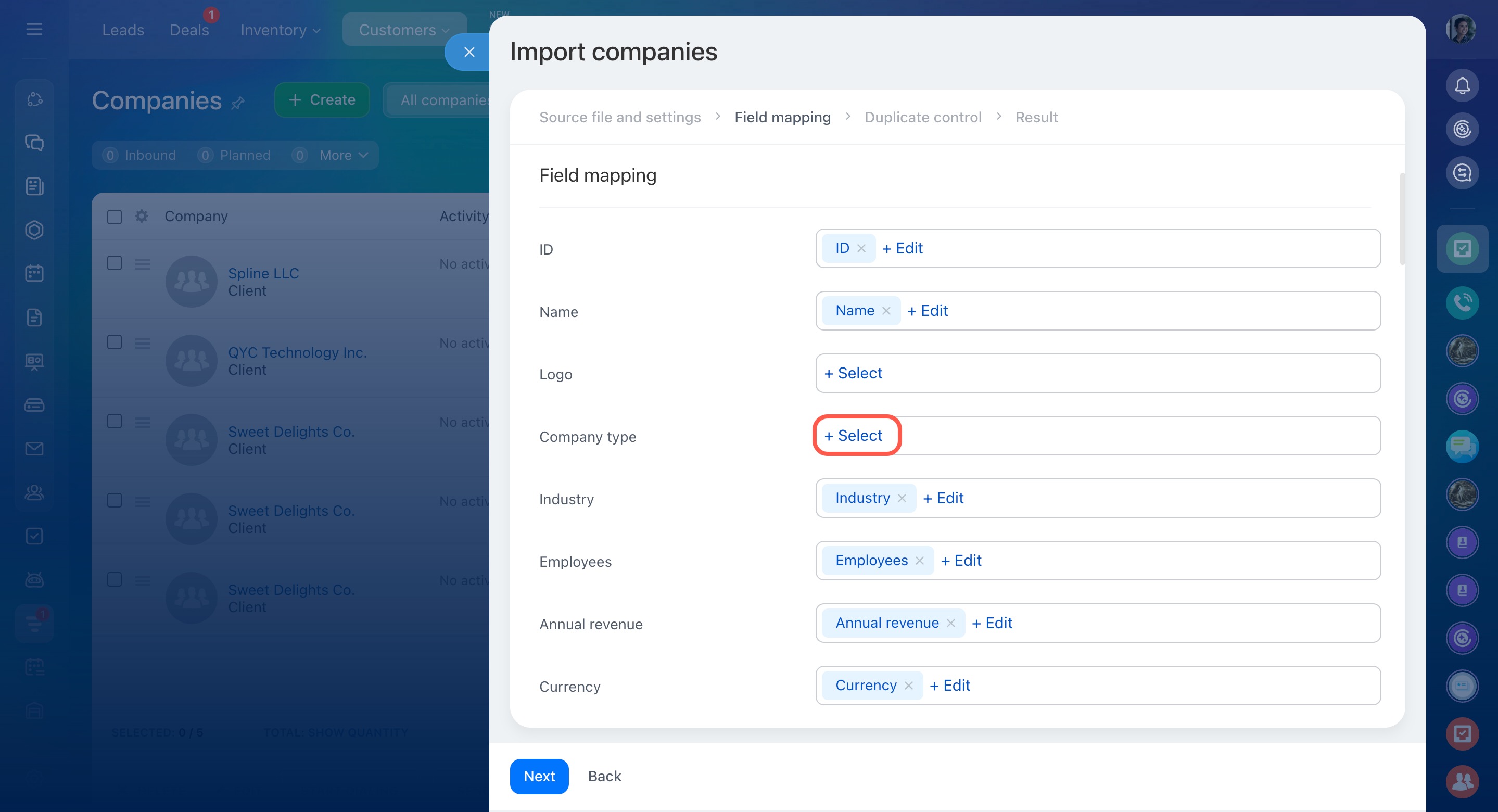Check field mapping. Fields in the import file must correctly match fields in the CRM item form. For example, data from the Company name field in the file must map to the Company name field in the form.