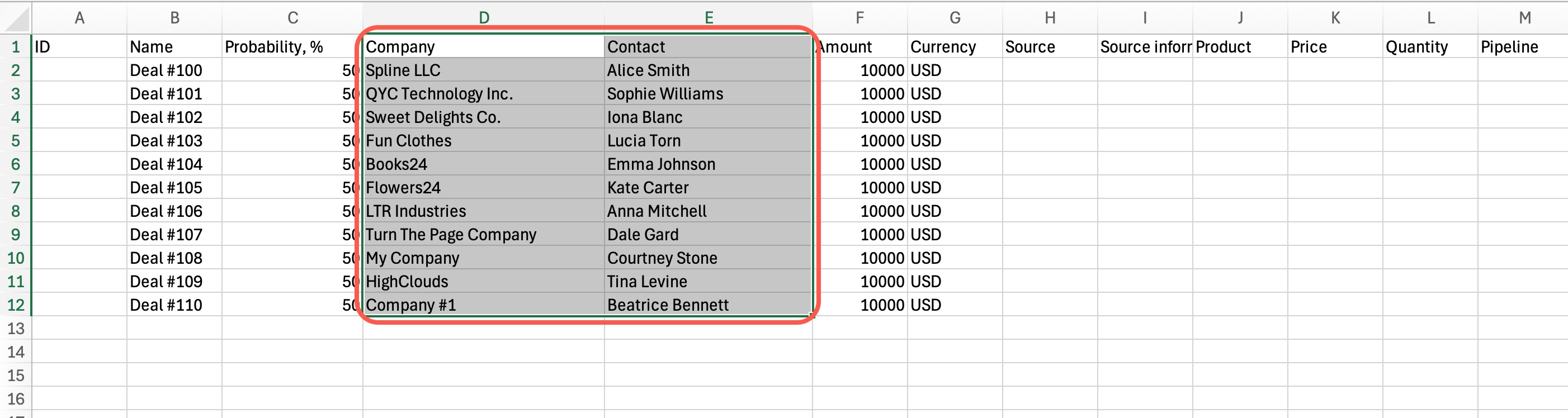 Prepare data. Download the import template and fill it in. In the Company field, enter company names to link deals. In the Contact field, enter the contact’s first and last name.