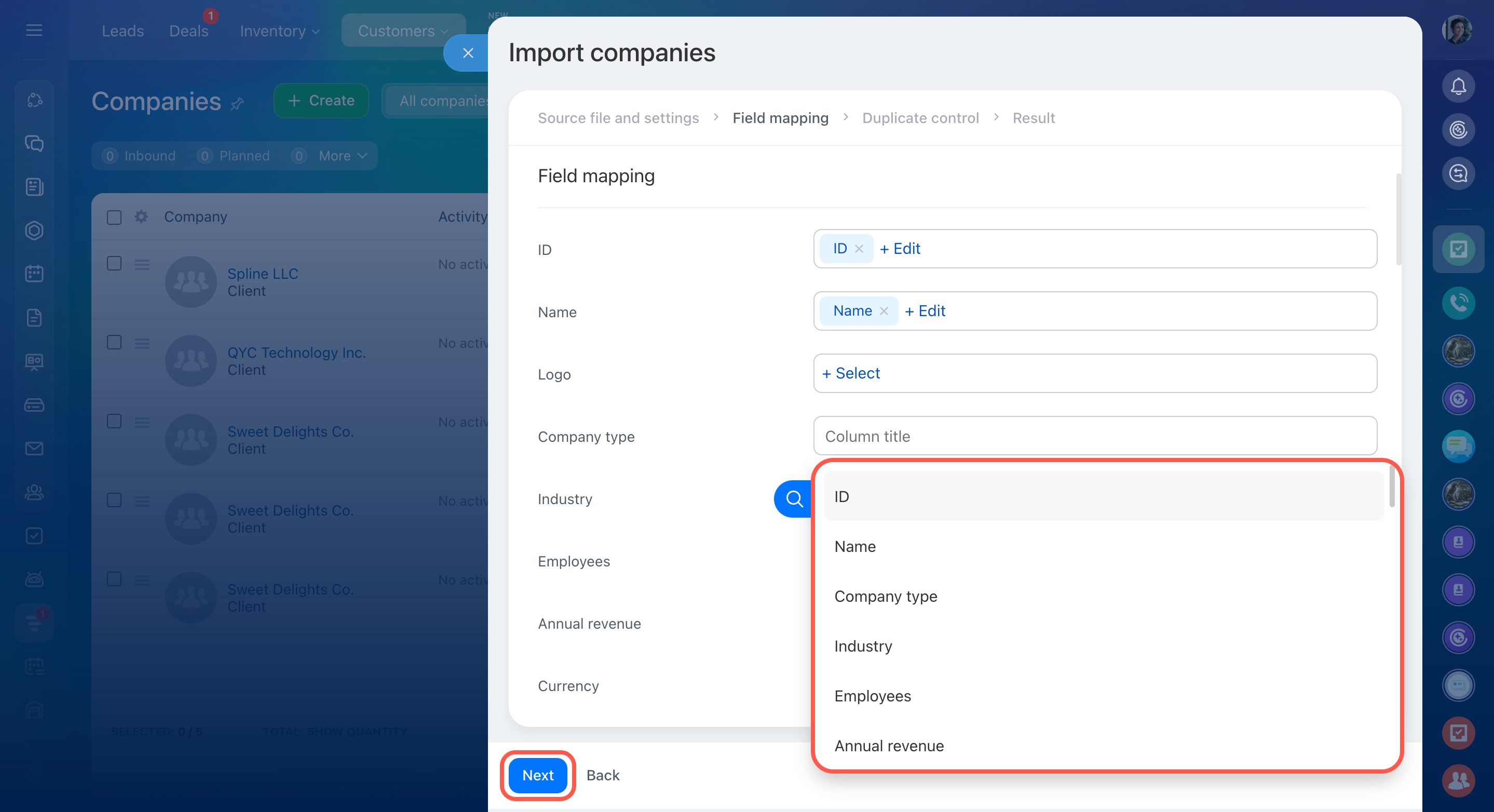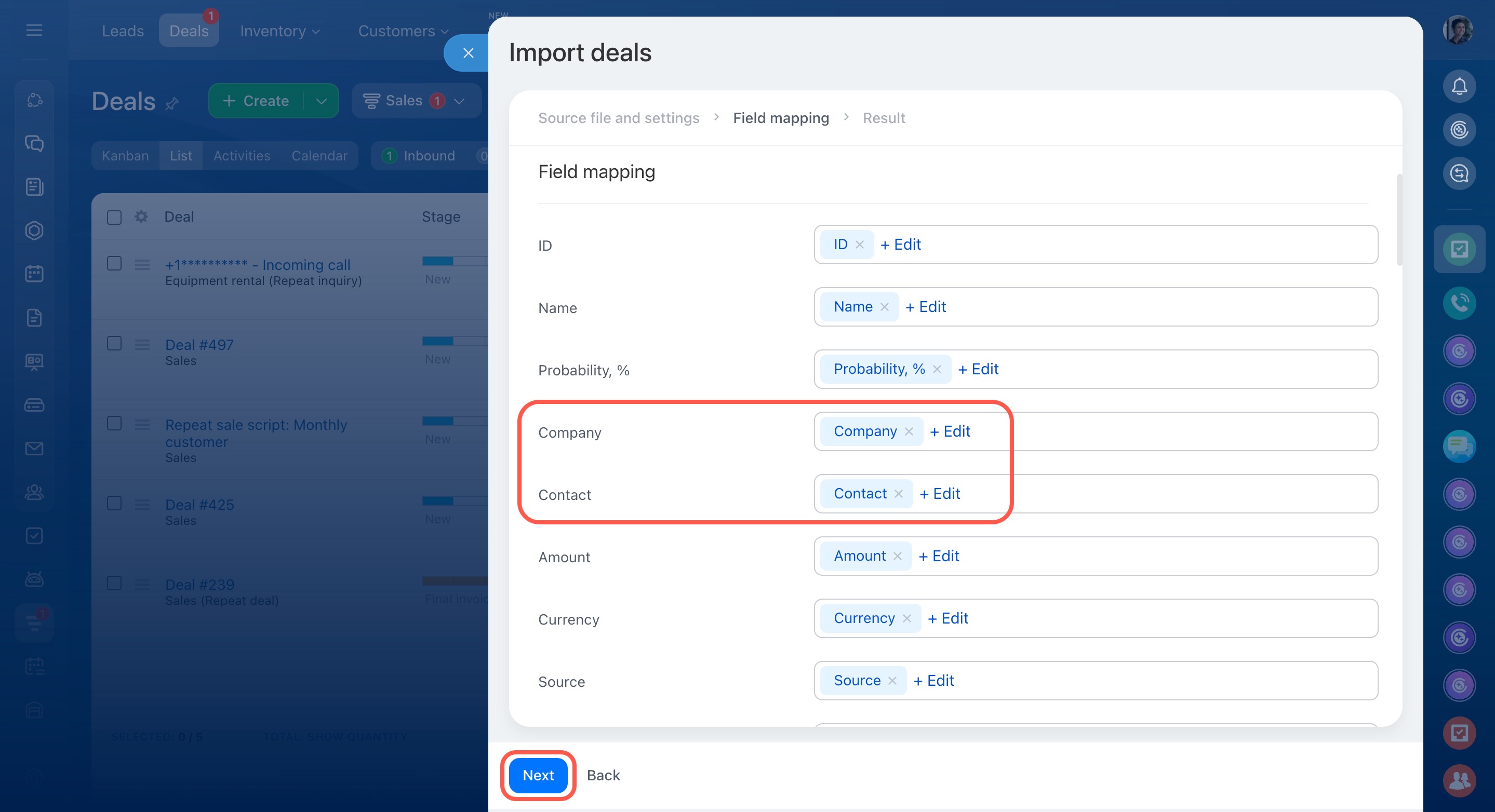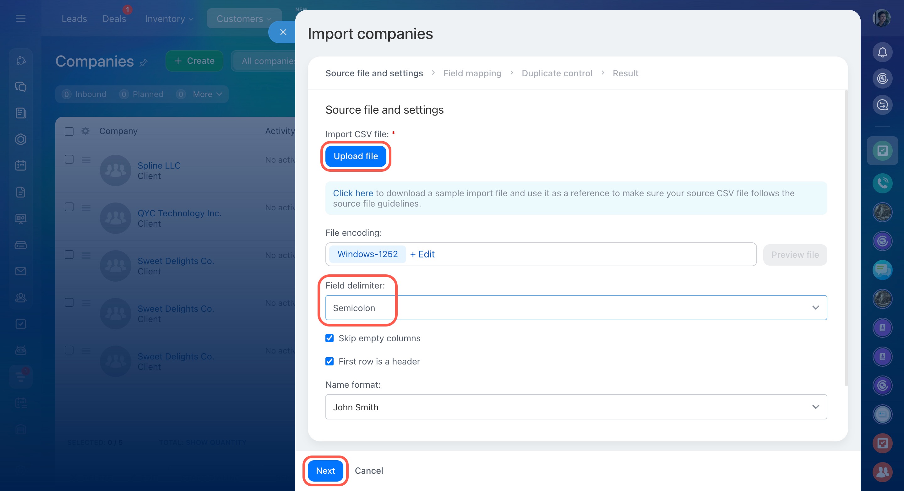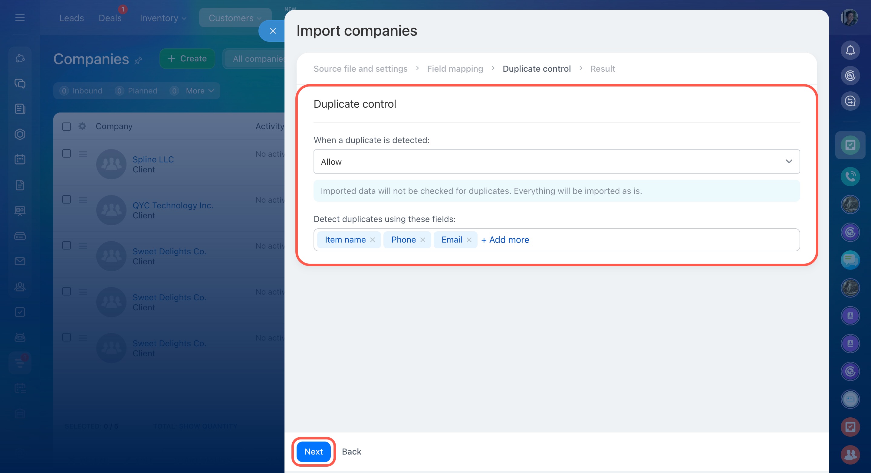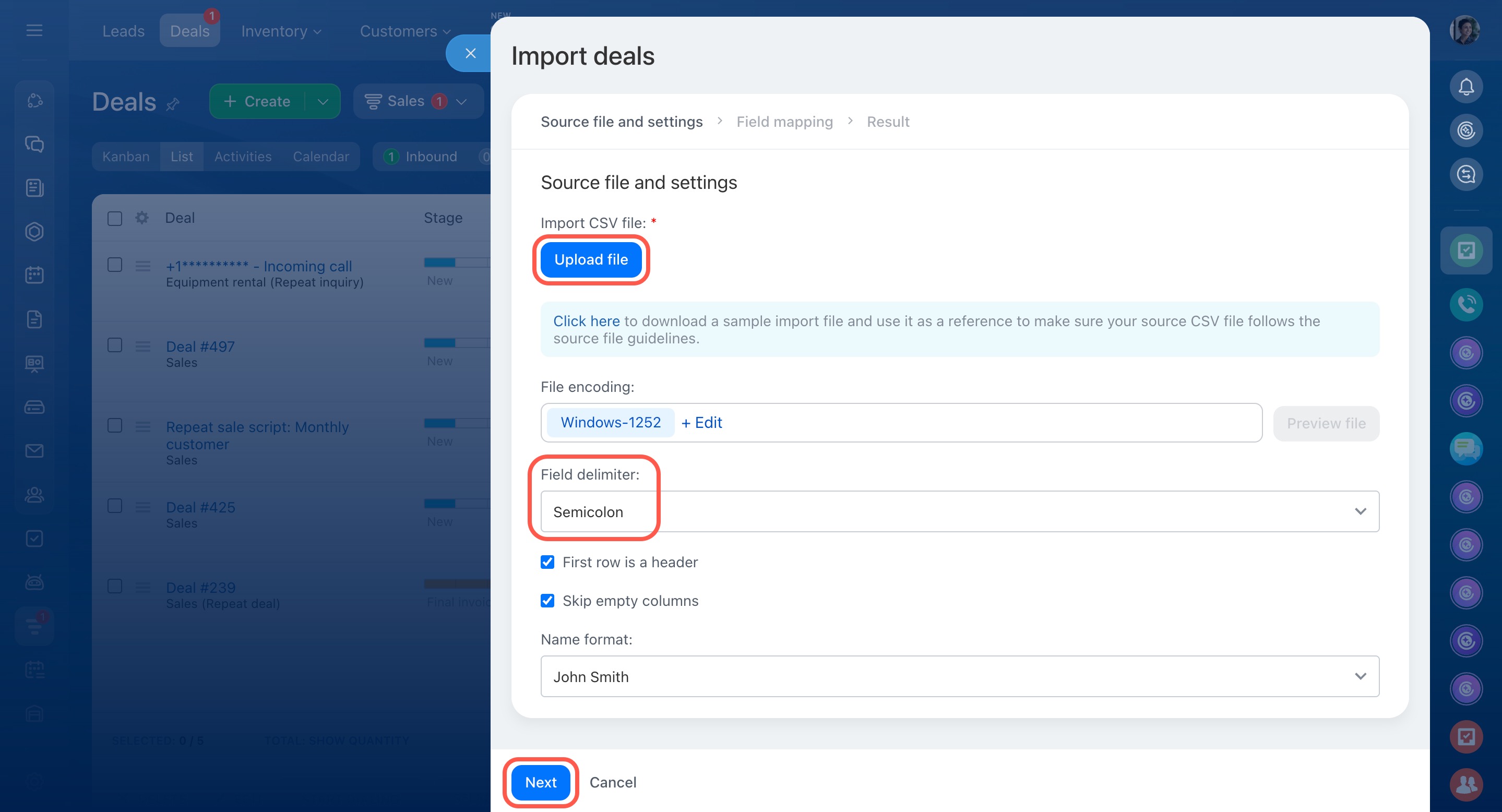 Existing deals cannot be updated during import. If a deal with the same name already exists in CRM, it will be imported again. When importing companies and contacts, choose how to handle duplicates.