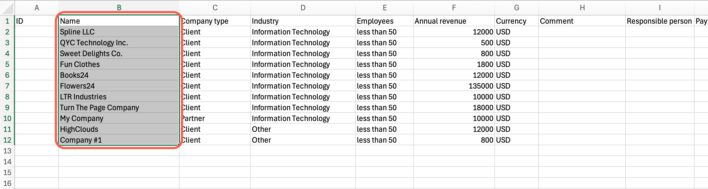 Items are matched by name. Enter customer names and company and deal names exactly as they appear in Bitrix24. Even small differences prevent items from linking. For example, the CRM contains Acme Corporation, but the import file contains Acme Corp.