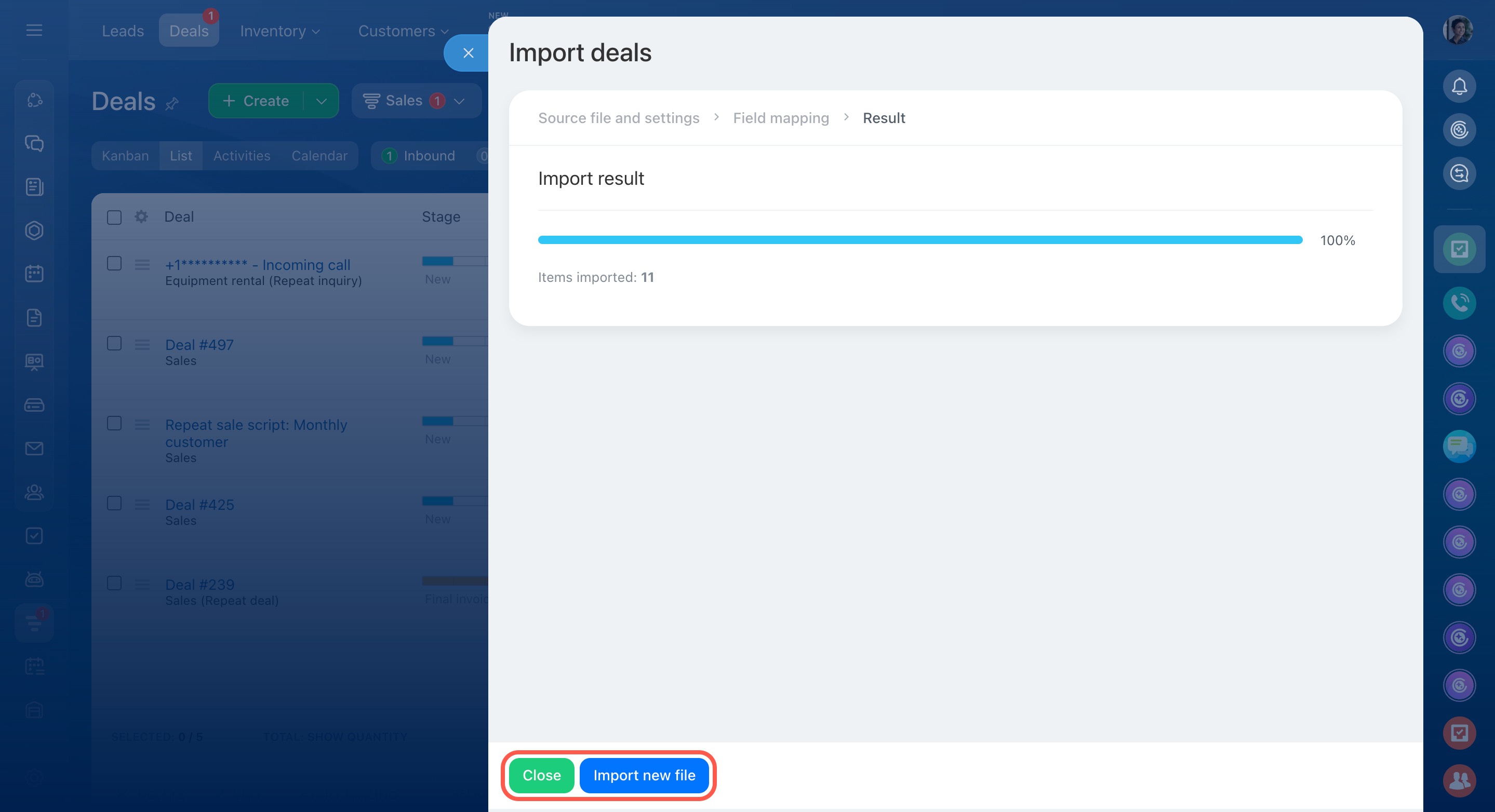 Complete the import. To upload another file, click Import another file. Deals appear under CRM > Deals.