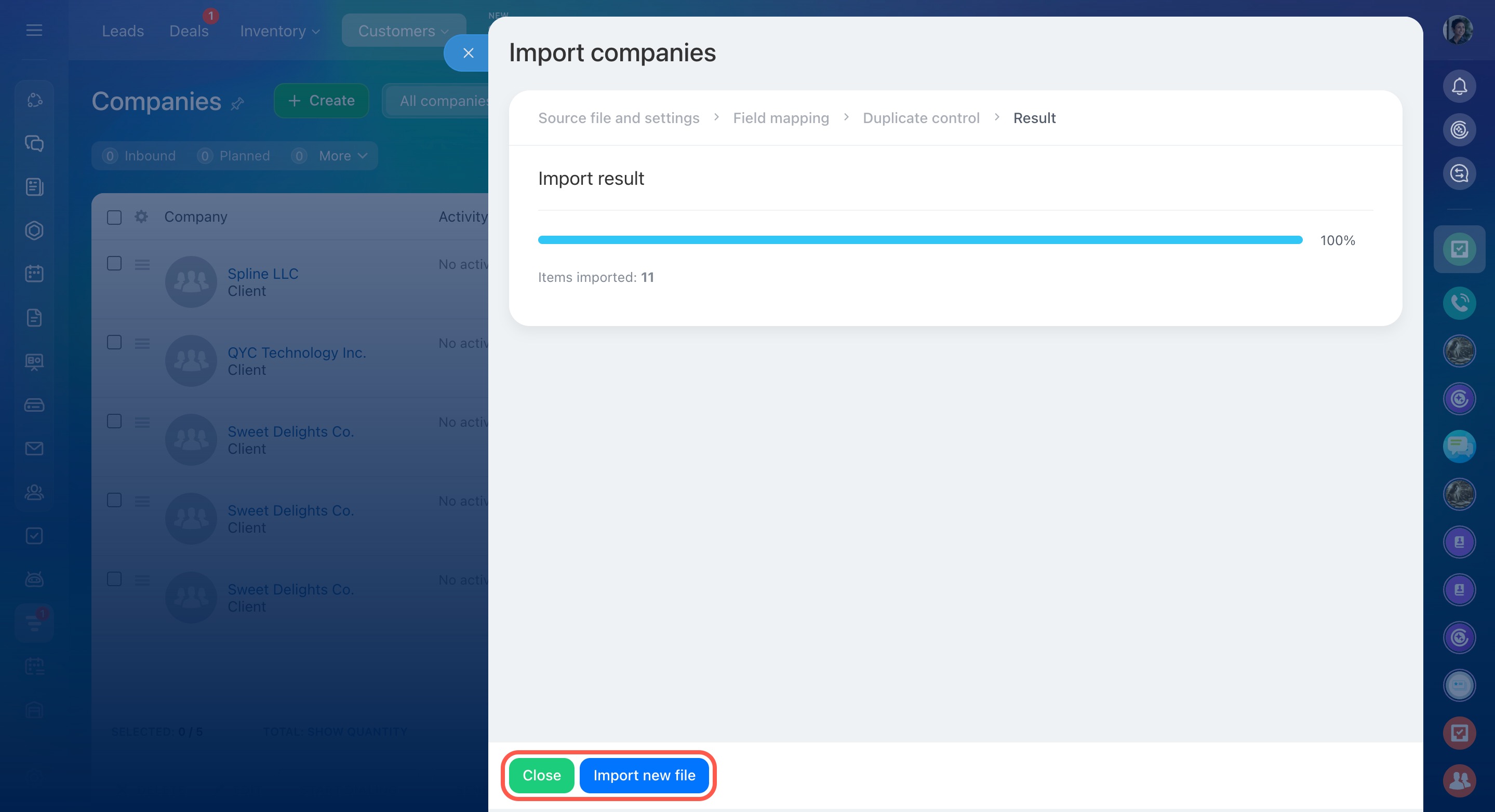 Wait for the import to finish. Click Close to complete the import. To upload another file, click Import new file. Companies appear under CRM > Customers > Companies.