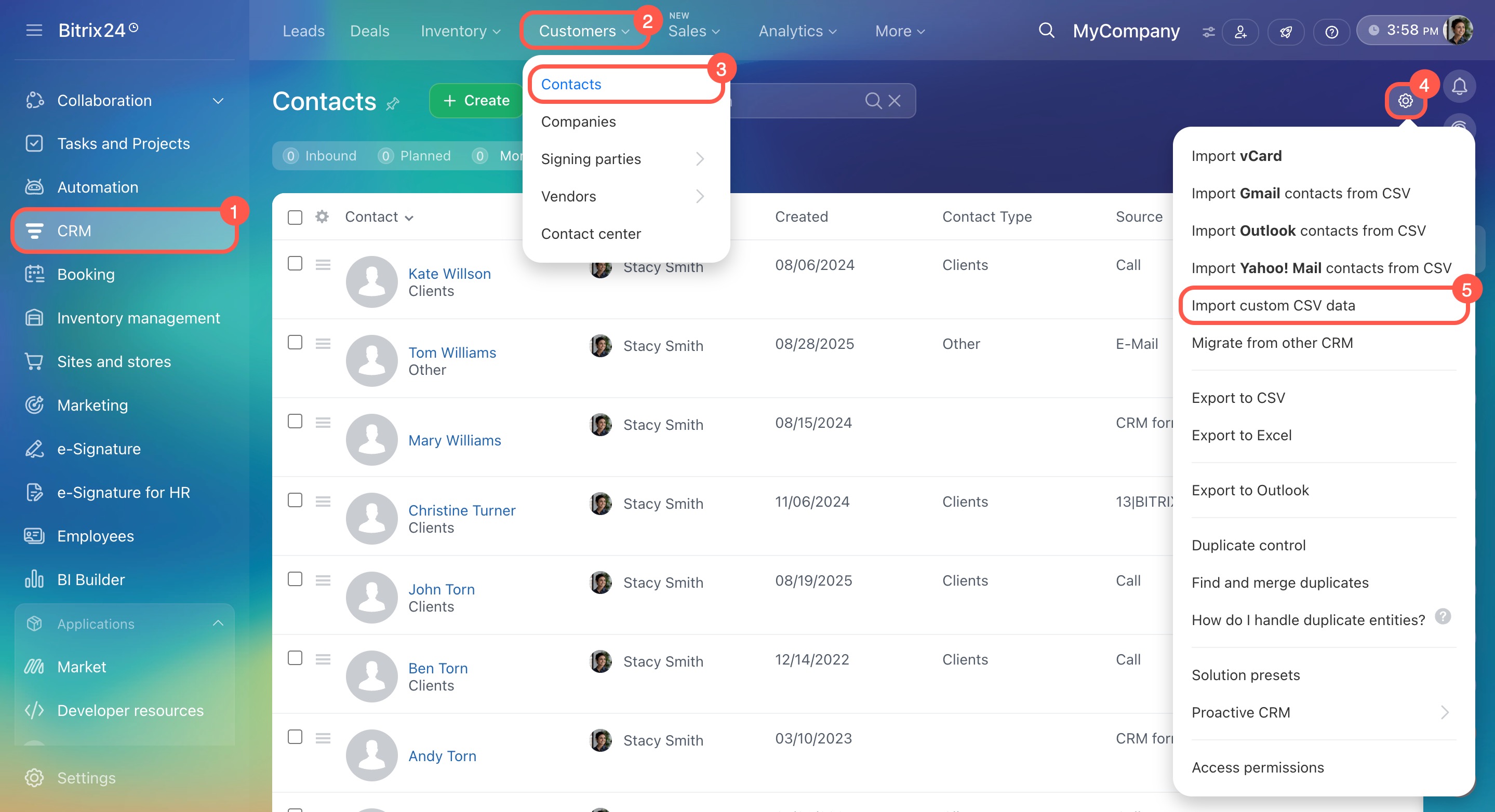 - Go to CRM > Customers > Contacts. Click Settings (⚙️) and select Import custom CSV data.